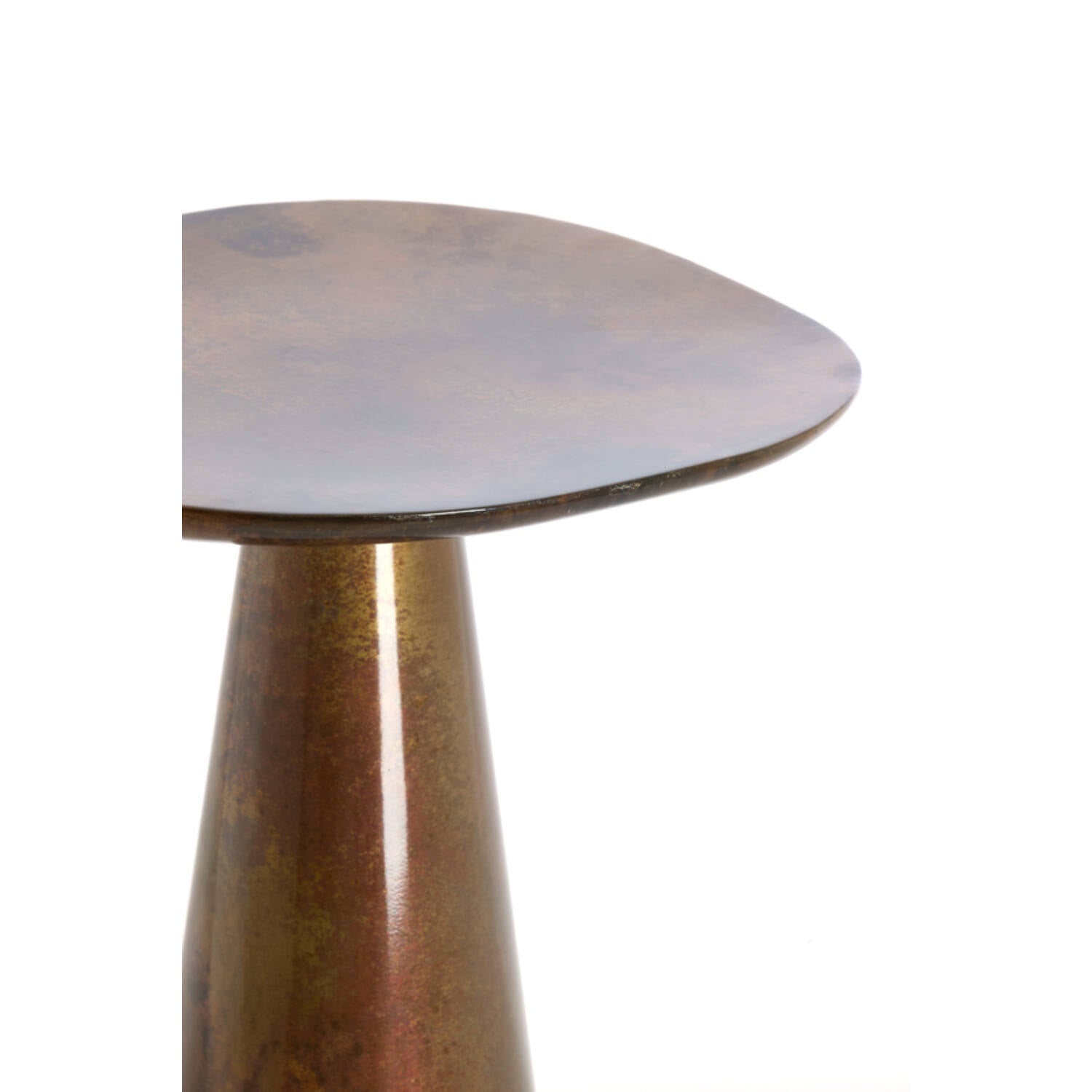 Az Abala asztal a „Retro Vibes” kollekció egyik jellegzetes darabja, amely a nemes fémfelületek melegségére épít. A teljes egészében fémből készült szerkezet különleges réz-bronz tónust kapott, amely gazdag textúrájával és selymes fényével bármely nappali vagy hálószoba ékköve lehet. Az 59 cm-es magasság kifejezetten alkalmassá teszi arra, hogy kanapé mellett vagy egy kényelmes fotel kísérőjeként használják, ahol elegendő helyet biztosít egy olvasólámpának, könyveknek vagy dekorációs tárgyaknak.