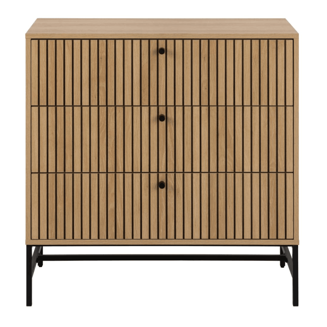The Albany chest of drawers with its oak-look slatted front has a truly stylish look. The contrasting effect of the natural oak colour and the black legs creates a balanced visual appeal. The chest of drawers with three wide drawers offers ample storage space, while also being space-saving, and the easy-to-use surface makes it even more practical.