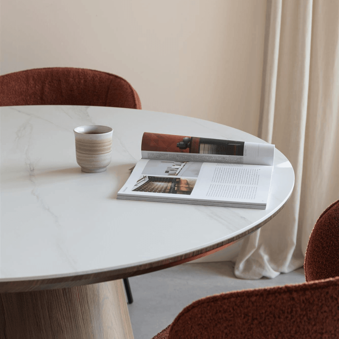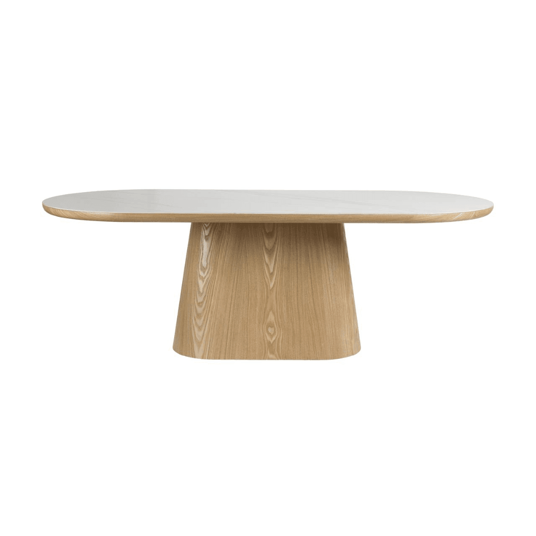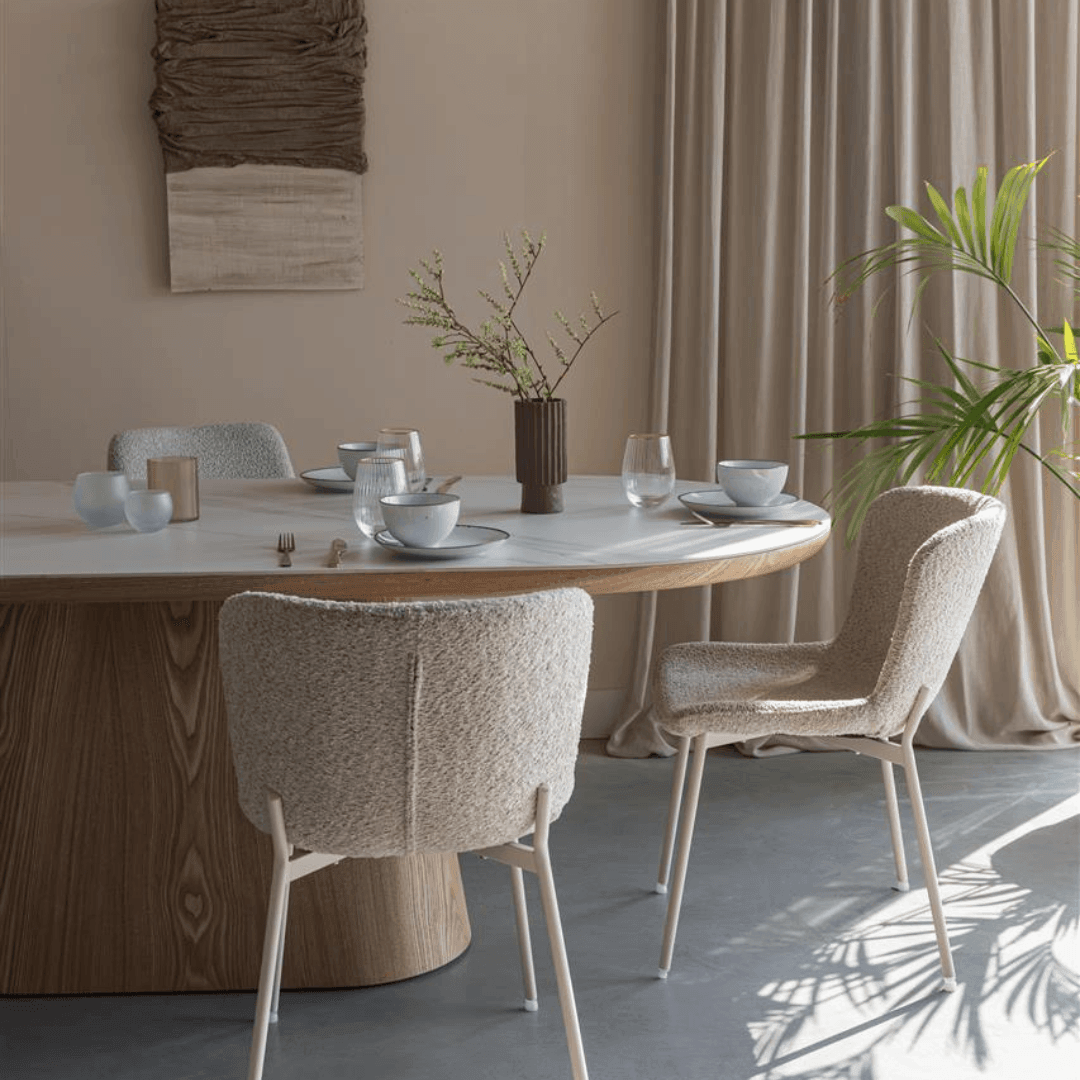 Az Almira fa étkezőasztal egy igazán különleges bútordarab. Ovális asztallapja márvány hatású, míg az asztalláb fából készült. A natúr szín anyaga tölgy, a sötétbarna anyaga dió. Párosítsd kedvenc étkezőszékeddel és élvezd a mindennapi étkezéseket luxus környezetben.