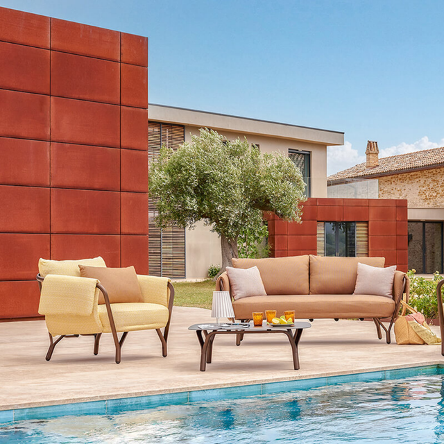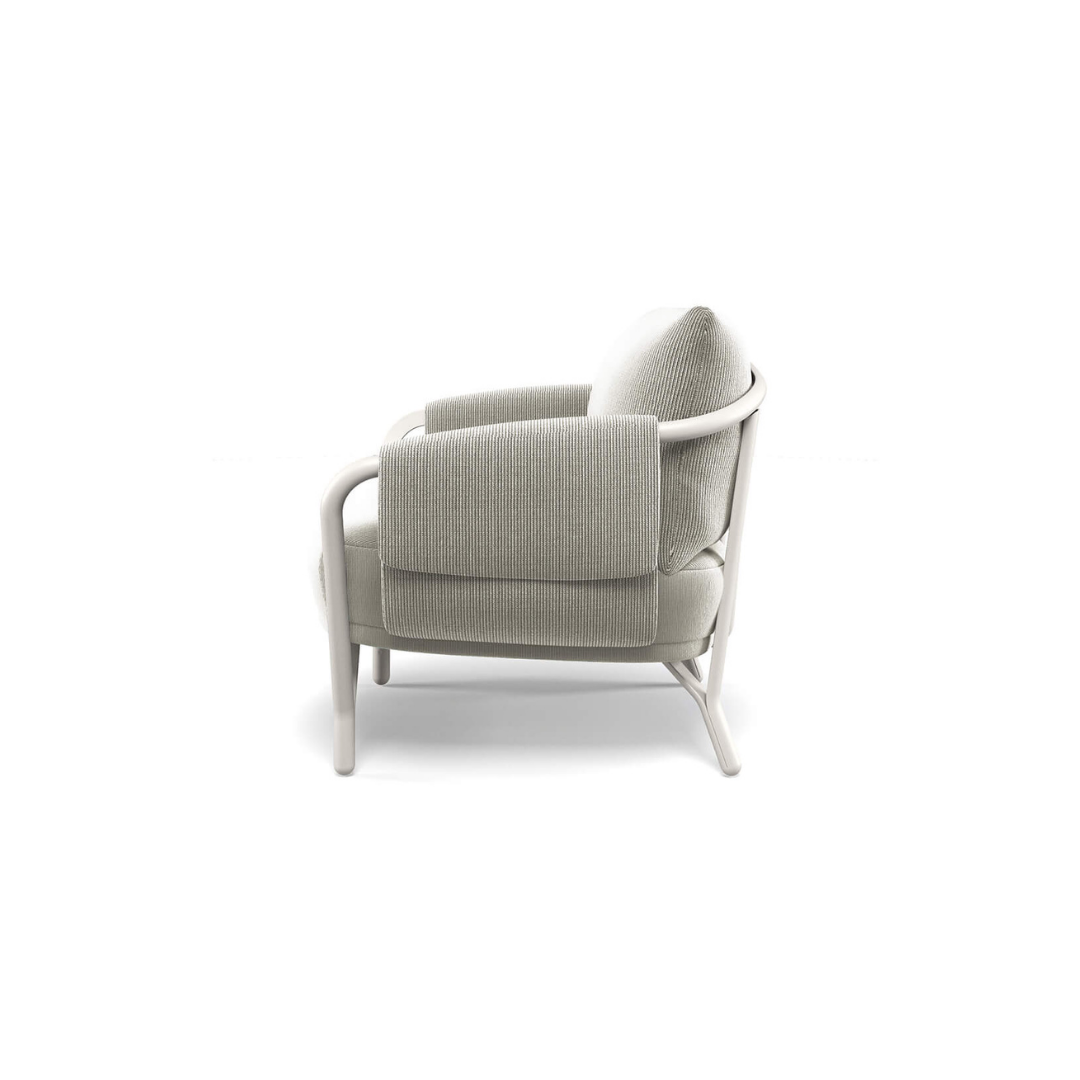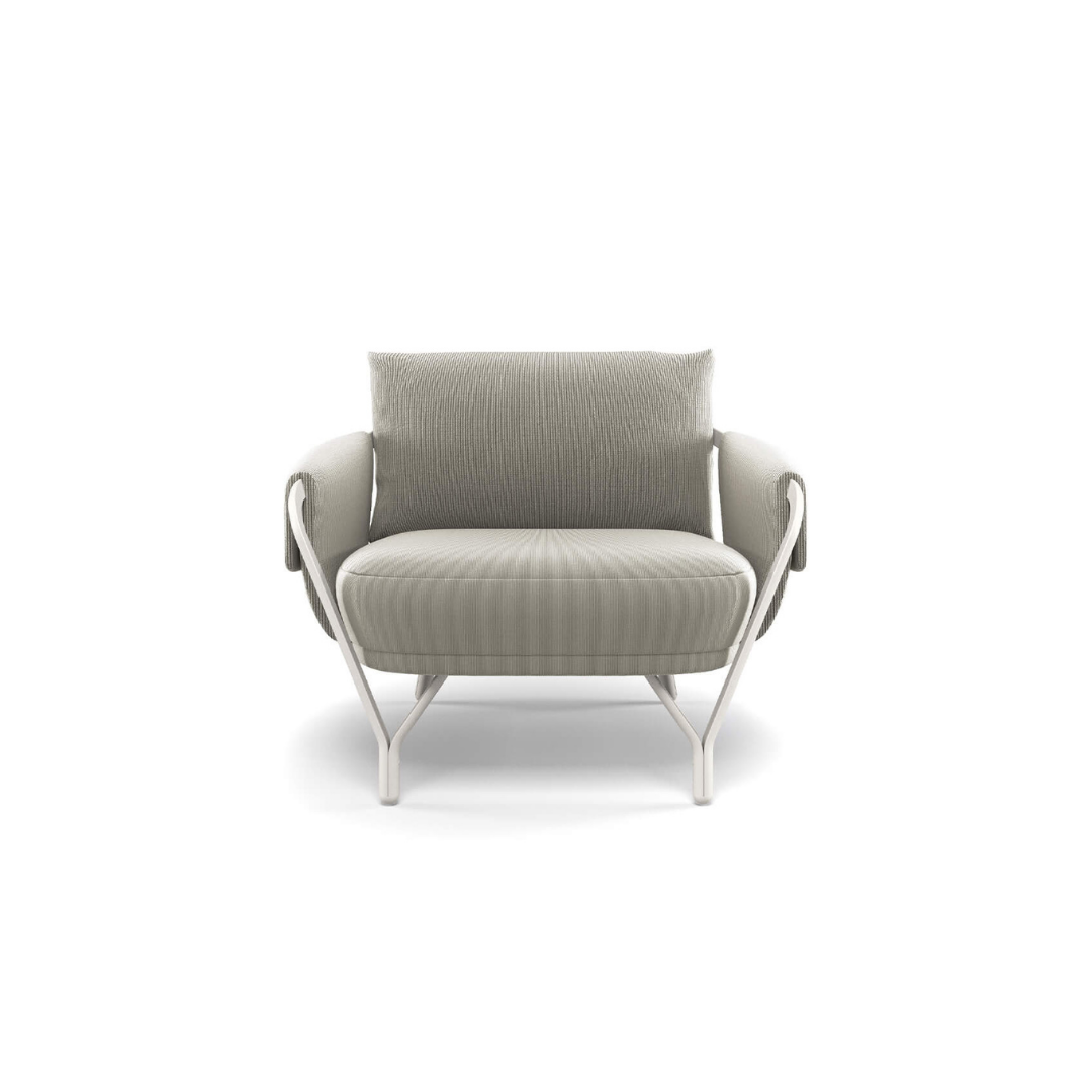 Az Angeletti & Ruzza által tervezett Angel kerti fotel elérhető a hozzáillő párnákkal, valamint különféle méretű asztalokkal, és étkezőszékkel is. Modern dizájnjával, íves grafikájával, kényelmével és alumínium szerkezetével az Angel tökéletes a kellemes légkör megteremtéséhez a teraszon vagy a kertbe is.