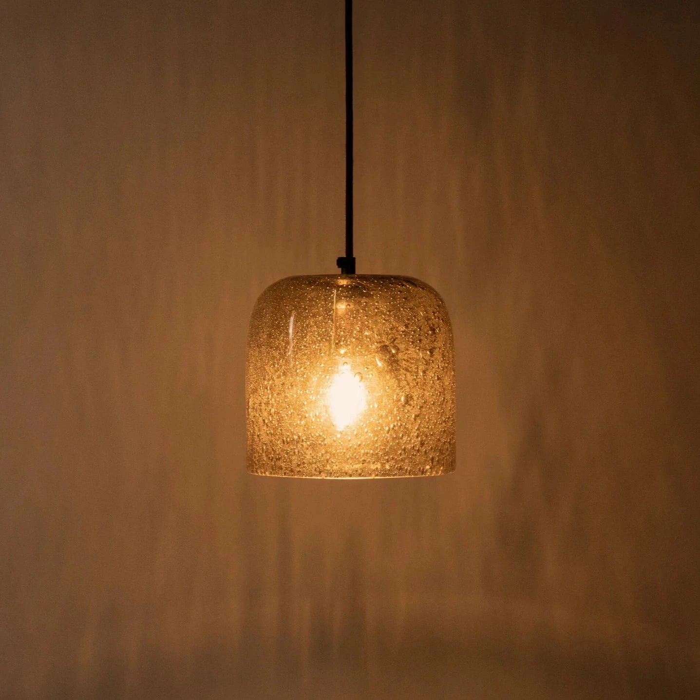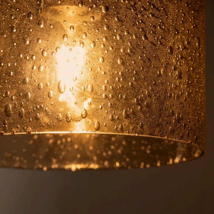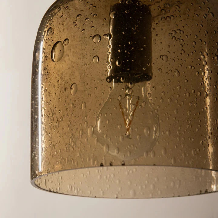 The soft light of the Aura pendant lamp creates a warm atmosphere in your home. The transparent, light brown color of the glass shade adds a subtle touch to the style of your bedroom or living room. The Aura lampshade is made of bubble glass and has a brown cable. It is also available in a taller size, so you can pair them together to create a dynamic and playful arrangement.