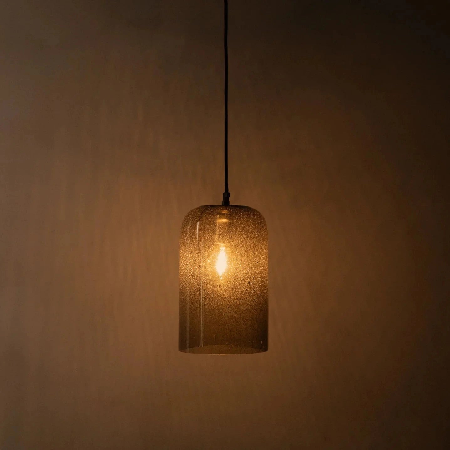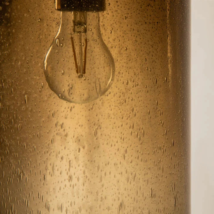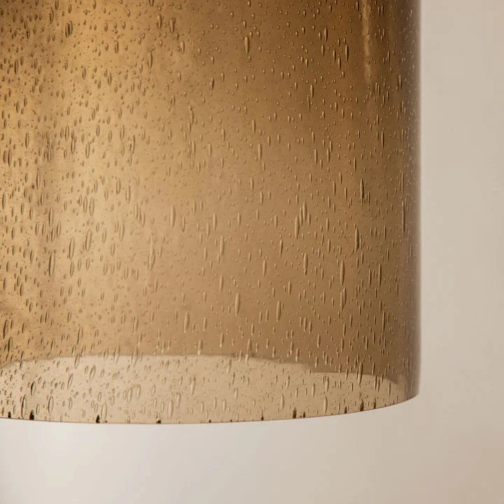 The soft light of the Aura pendant lamp creates a warm atmosphere in your home. The transparent, light brown color of the glass shade adds a subtle touch to the style of your bedroom or living room. The Aura lampshade is made of bubble glass and has a brown cable. It is also available in a smaller size, so you can pair them together to create a dynamic and playful arrangement.