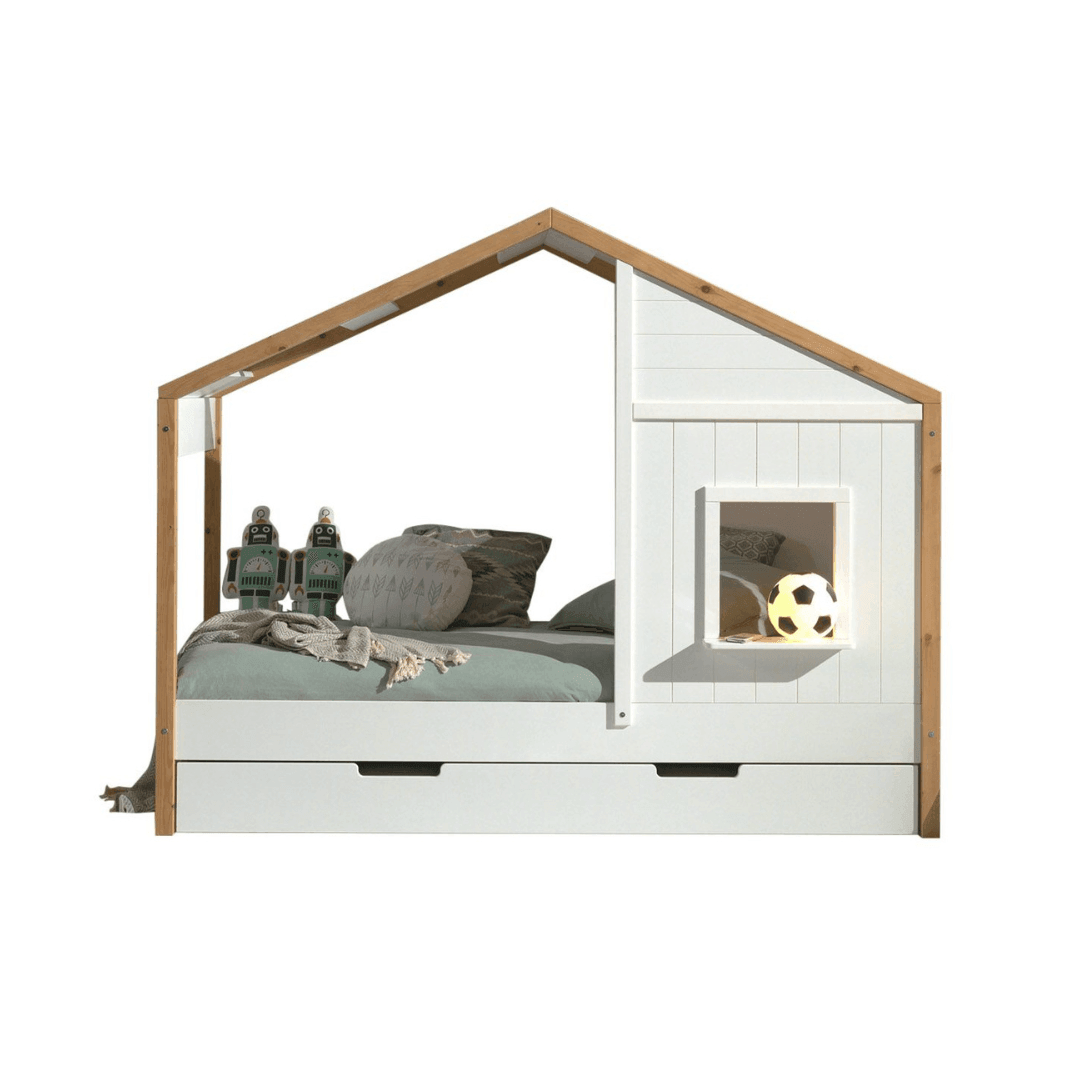 A cottage bed that your child will surely love. Made of white lacquered pine and has natural wood details. The windowsill can also function as a side table, and the wheeled and pull-out bed frame can also be used as an extra bed. The bed frame size is 90x200cm. The mattress and other decorations are not included.