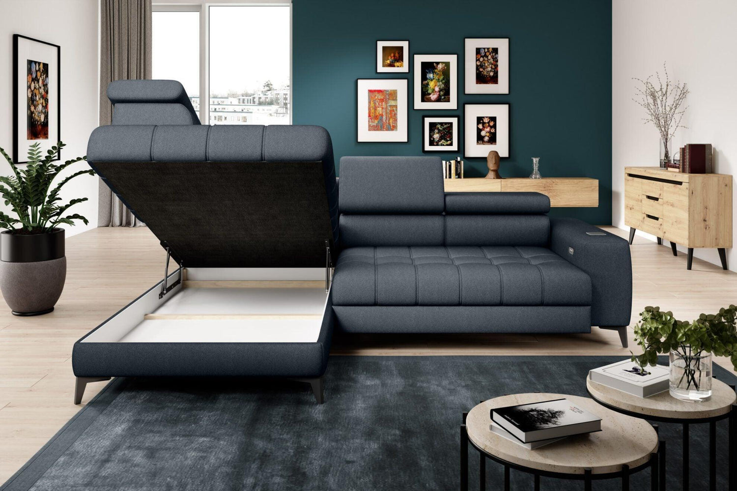 A Baggio egy olyan sarokkanapé, amely számos funkciót kombinál, miközben megőrzi az elegáns és modern vizuális hatást. A motoros ülésmélység állítás és az állítható fejtámla funkció rendkívüli kényelmet biztosít. Ennek a modellnek a megkülönböztető eleme a beépített indukciós töltő, amelyet minden Baggio kanapé használója biztosan élvezni fog. Az ágyneműtartó pedig biztosítja a takarók és párnák rendezett tárolását.