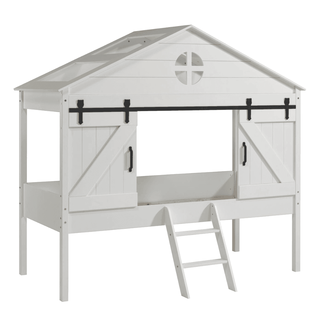 The Barnie children's bed is a high-quality piece of furniture made of white lacquered wood. The design of the bed is inspired by a stable. The bed is raised and has two side doors for safety. The space under the bed is perfect for storing toys and boxes. The sleeping surface can accommodate a 90x200 cm mattress. The product does not include the bed frame and mattress.