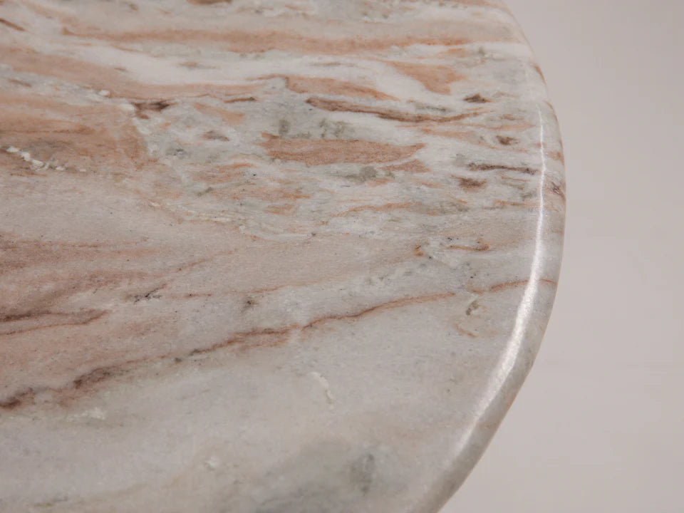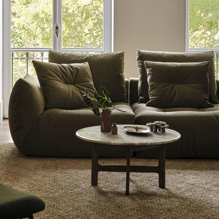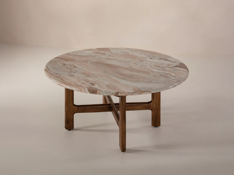 The Bia coffee table combines the richness and naturalness of marble and wood with a versatile and elegant silhouette. It offers style and solid construction. The table has a classic yet modern look, highlighted by the pattern of the marble top and the cross legs. With a diameter of 80 cm, it is ideal for both small and large living rooms.