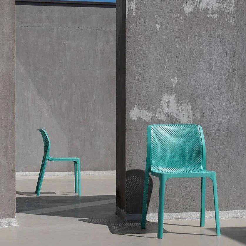 Bit is an armless chair made of UV-treated, mass-colored fiberglass resin, with a sophisticated design and attention to detail. Its perforation pattern and wide range of colors make it suitable for both indoor and outdoor use. Monoblock design, uniformly colored polypropylene resin, matte finish, non-slip feet, recyclable material.