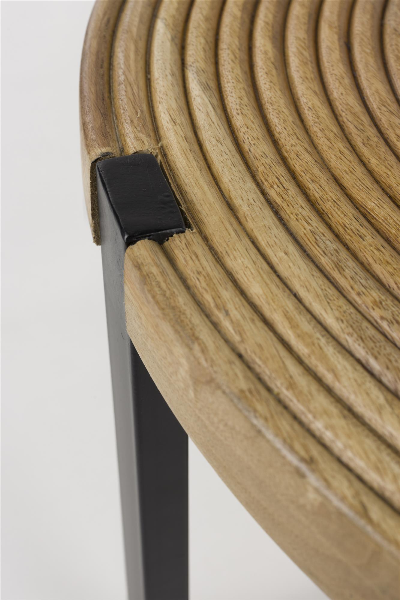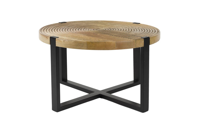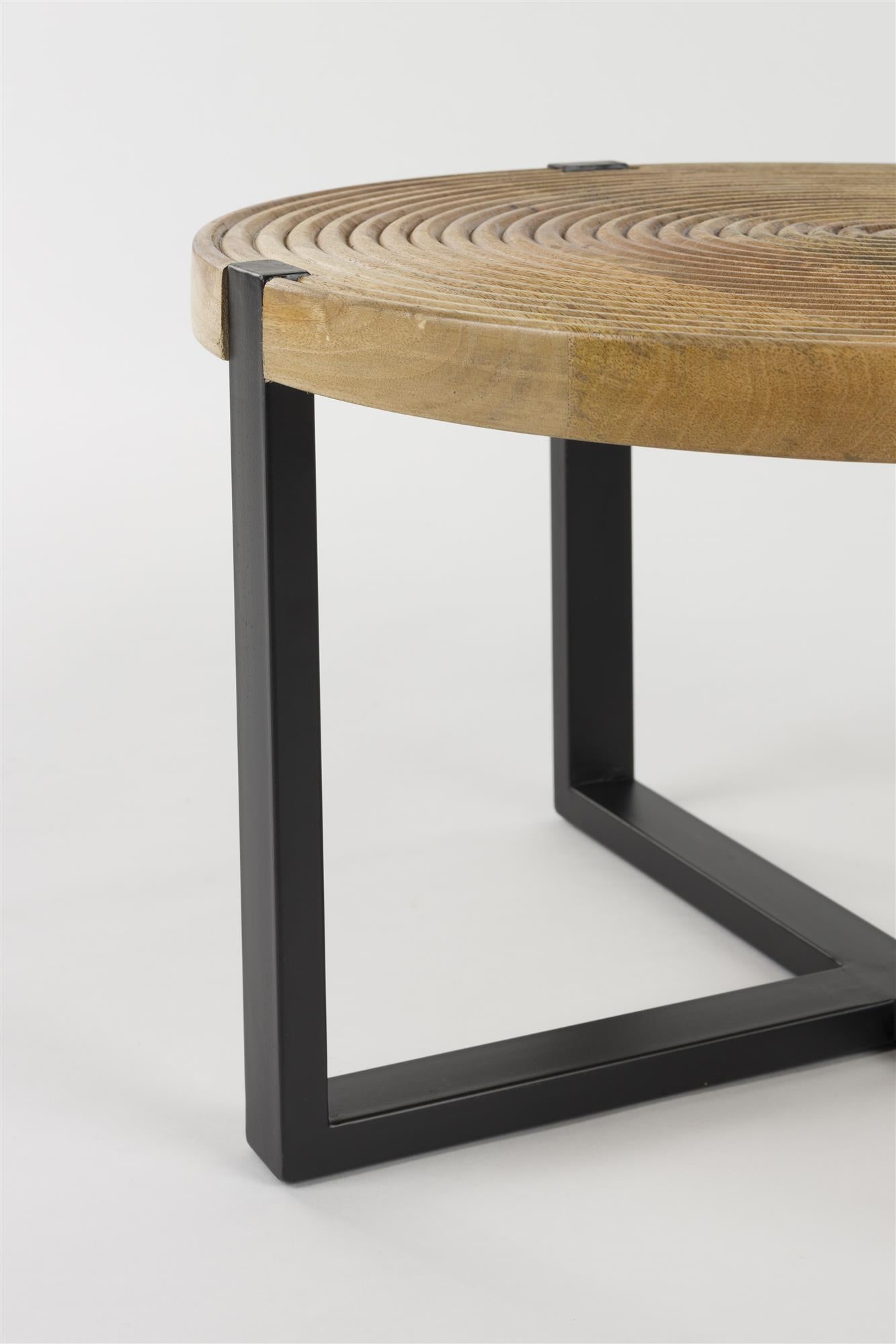 Vigyen természetes melegséget és modern stílust nappalijába a Buz dohányzóasztallal. Az asztallap valódi mangófából készült, amelynek felületét kézműves jellegű, faragott koncentrikus körök díszítik, így minden darab megismételhetetlen textúrával bír. A robusztus, fekete színű vas lábak keresztezett kialakítása nemcsak stabilitást biztosít, hanem stílusos, indusztriális kontrasztot is alkot a fa természetes barna árnyalatával. Kompakt méretei és kerek formája miatt ideális választás kisebb nappalikba is, ahol központi, mégis légies eleme lehet a berendezésnek.