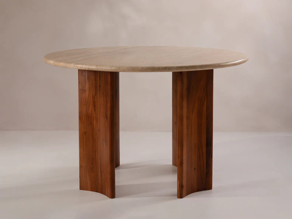 The Cleo dining table is elegant and brings natural materials into your home, making it a stylish focal point. The outward-curving legs give it a unique look. The round table has acacia wood legs and a beautiful limestone top, all made with rounded lines. The Cleo collection also includes a console table and a coffee table.