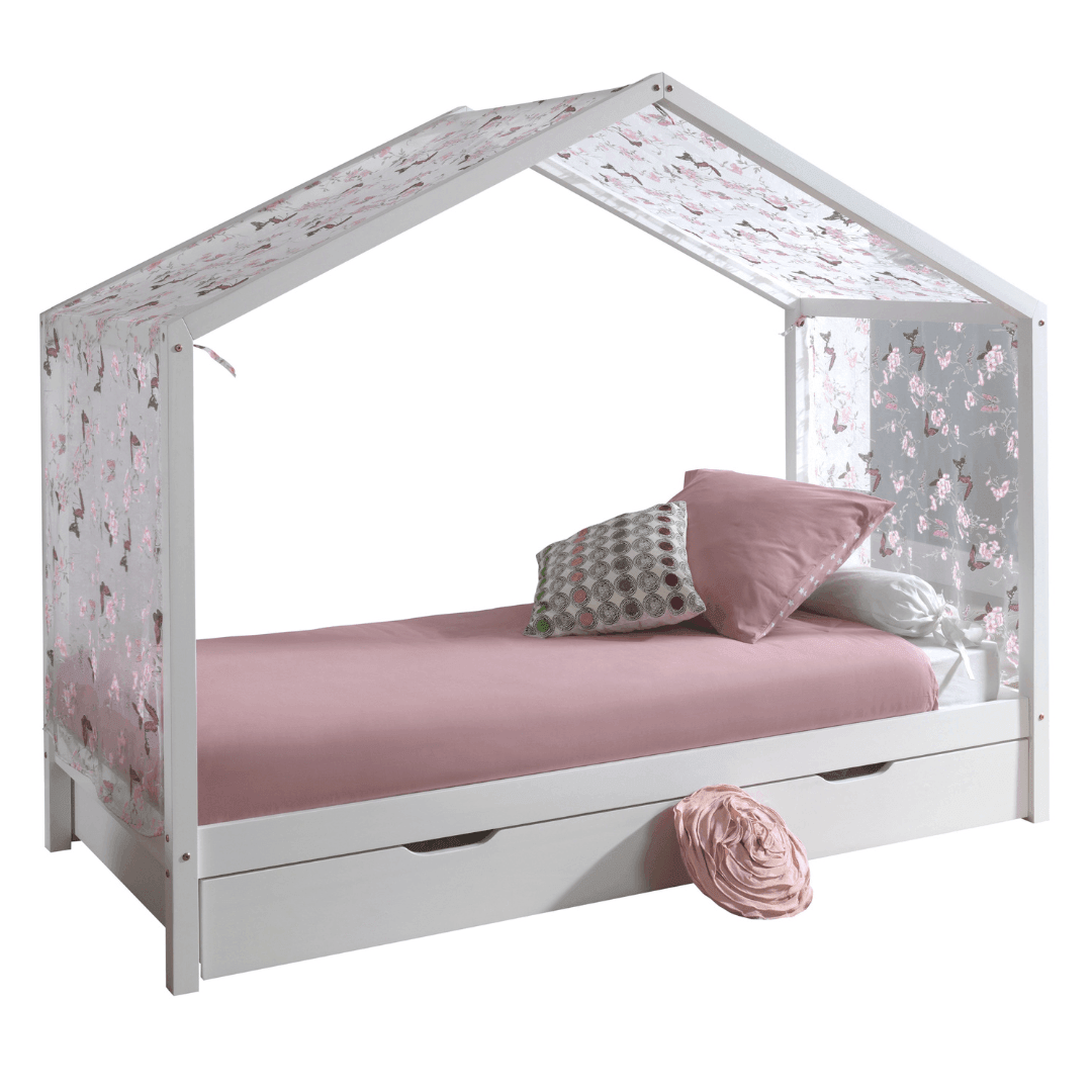 The Dallas cottage bed set is based on a minimalist yet trendy piece of furniture made of solid pine. Size: 90x200 cm. You can personalize its style with colorful pillows, blankets, or string lights. A butterfly fabric is also part of the product, so you can achieve a special and fabulous overall effect. The wheeled, pull-out bed linen holder helps keep the room tidy. Available in natural and white, so it easily fits into any interior. The mattress and other decorations are not included.