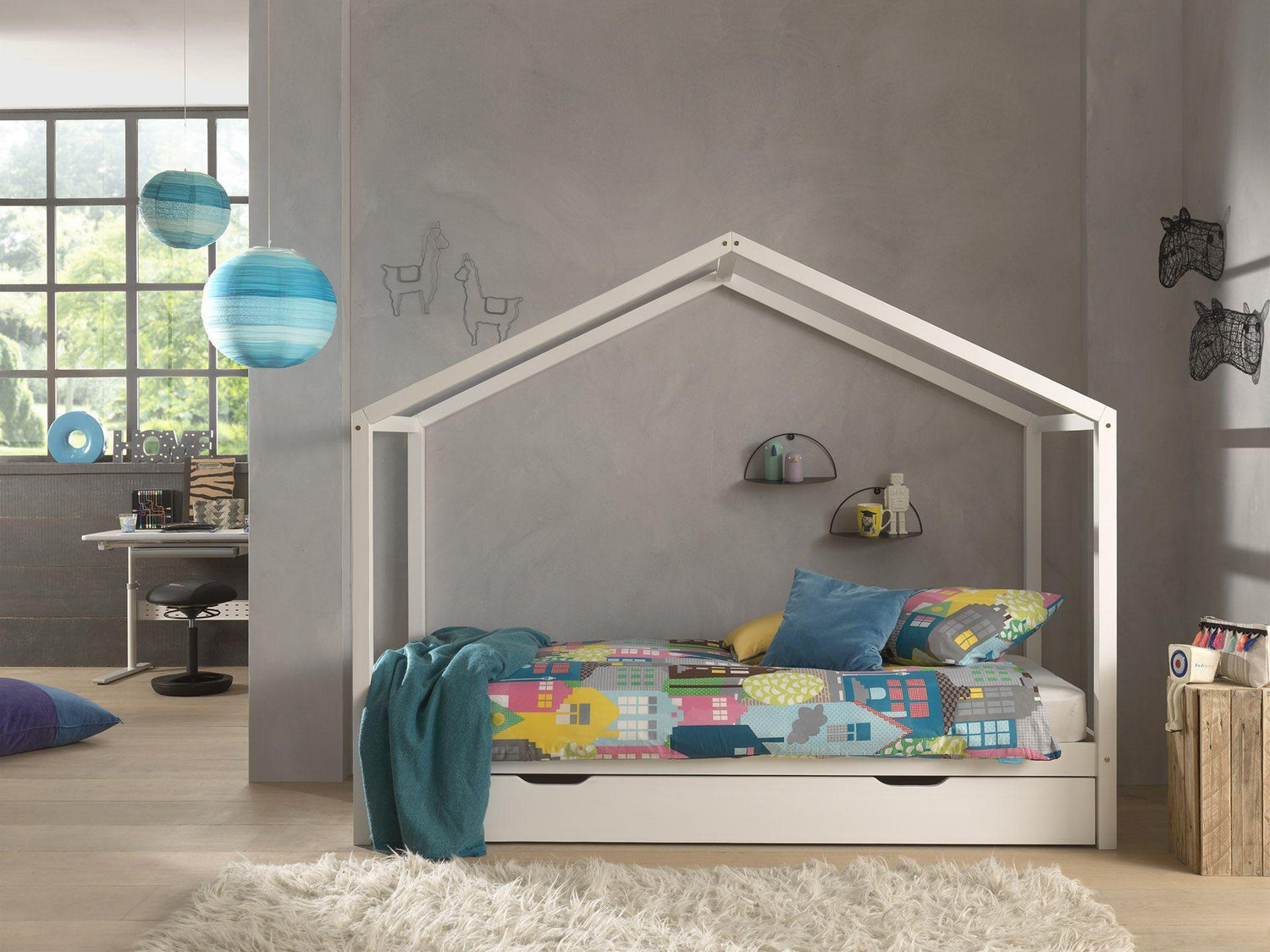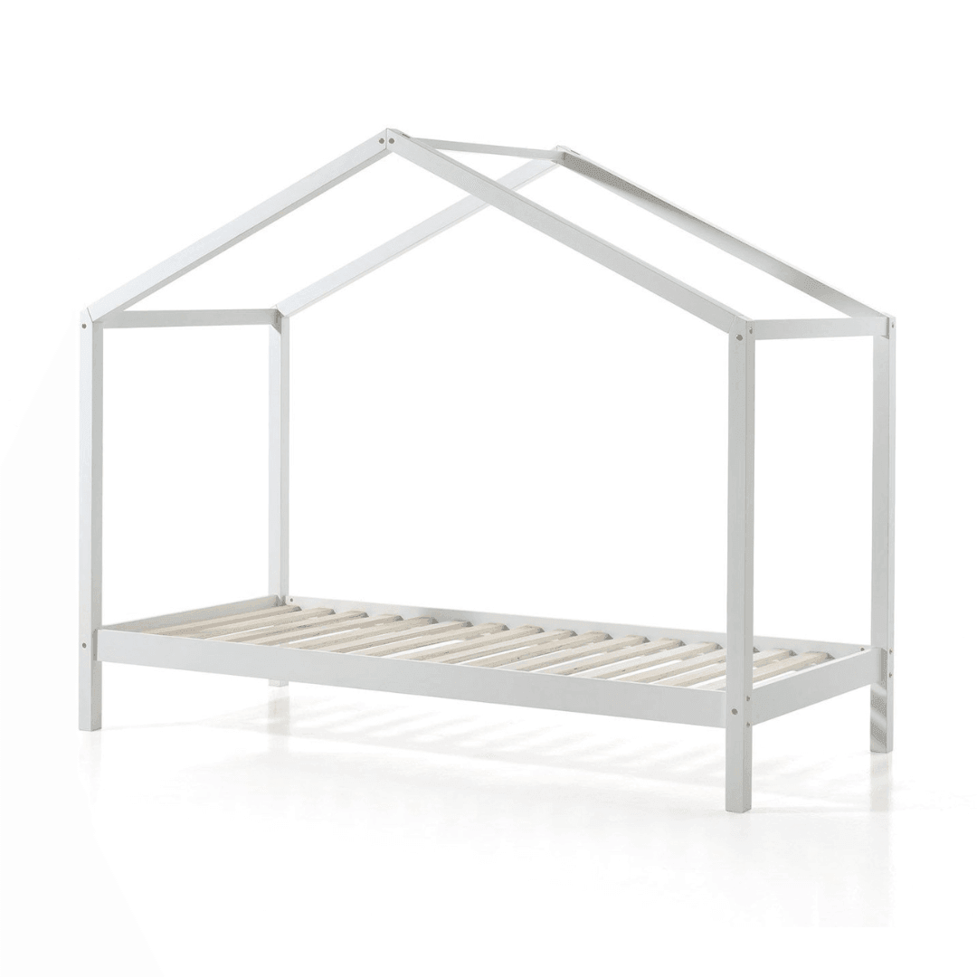 The Dallas cottage bed is a clean-looking piece of furniture that includes a roof-like frame, a 90x200cm bed slat, and a wheeled, pull-out bed linen holder. Its practical design saves space, yet it is a trendy piece of furniture. Available in natural and white, it easily fits into any interior. It can be personalized with lights, fabrics, or toys. The mattress and other decorations are not included.