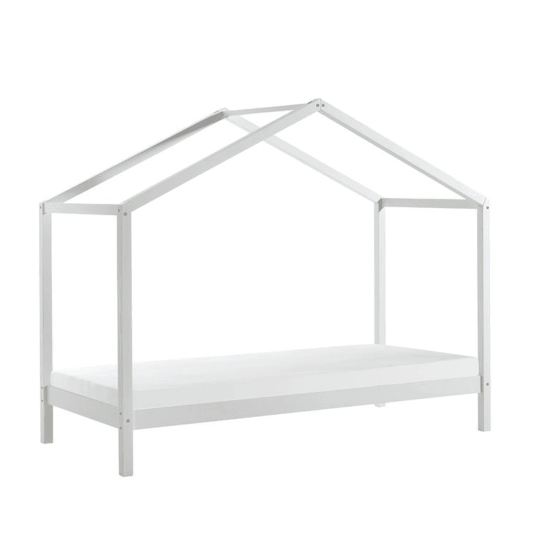 The Dallas cottage bed is a minimalist-looking piece of furniture that includes a roof-like frame, a bed slat, and a 90x200x10cm soft mattress. Its practical design saves space, yet it is a modern and playful piece of furniture. It is available in natural and white, so it easily fits into any interior. It can be personalized with lights, materials, or toys. A linen holder can also be purchased to help keep the room tidy.