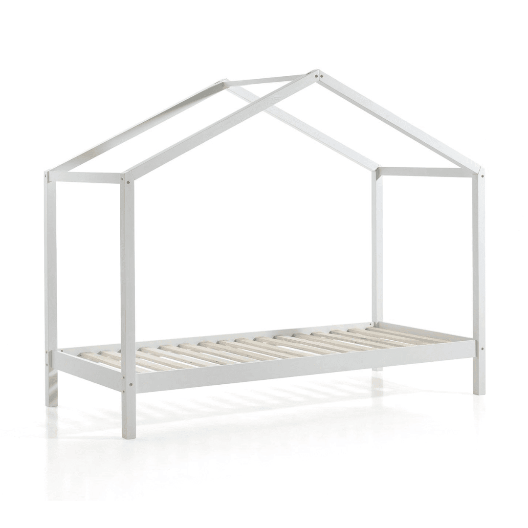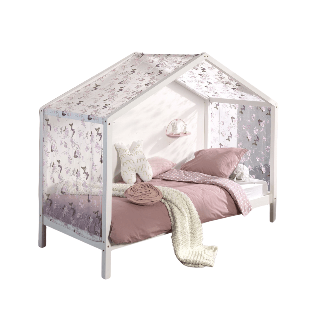 The Dallas cottage bed is a minimalist-looking piece of furniture that includes a roof-like frame, a 90x200cm bed slat, and a butterfly-patterned, translucent fabric that can be placed on the frame. Its practical design saves space, yet it is a modern and playful piece of furniture. It is available in natural and white, so it easily fits into any interior. It can be further decorated with lights or toys to personalize it. A linen holder can also be purchased to help keep the room tidy. The mattress and other decorations are not included.