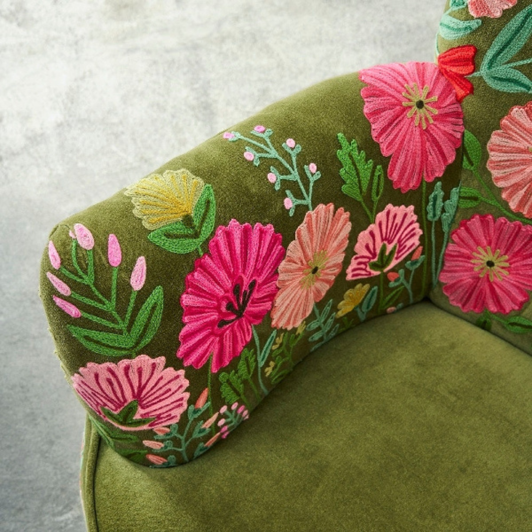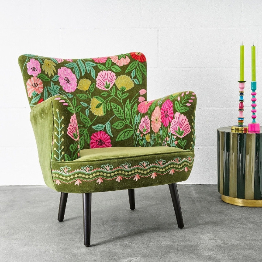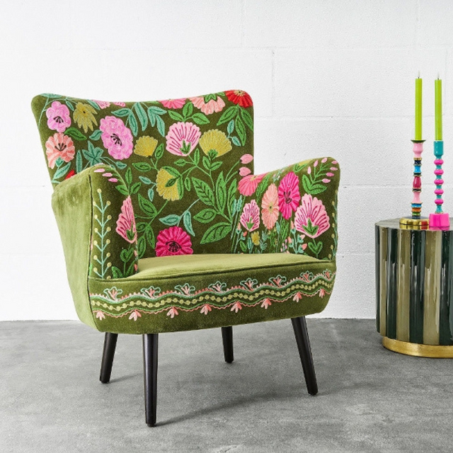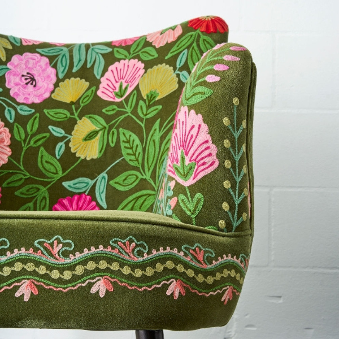 Az Emma fotel egy stílusos és kényelmes bútordarab, amely tökéletesen illeszkedik a bohém, vagy modern otthonokba. Élénk színű, kézzel hímzett virágokkal díszített világoszöld bársony borítással kapható, valamint fekete fa lábakkal rendelkezik. Klasszikus kialakítása, és puha párnázata miatt komfortos ülésélményt biztosít.
