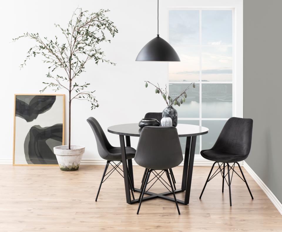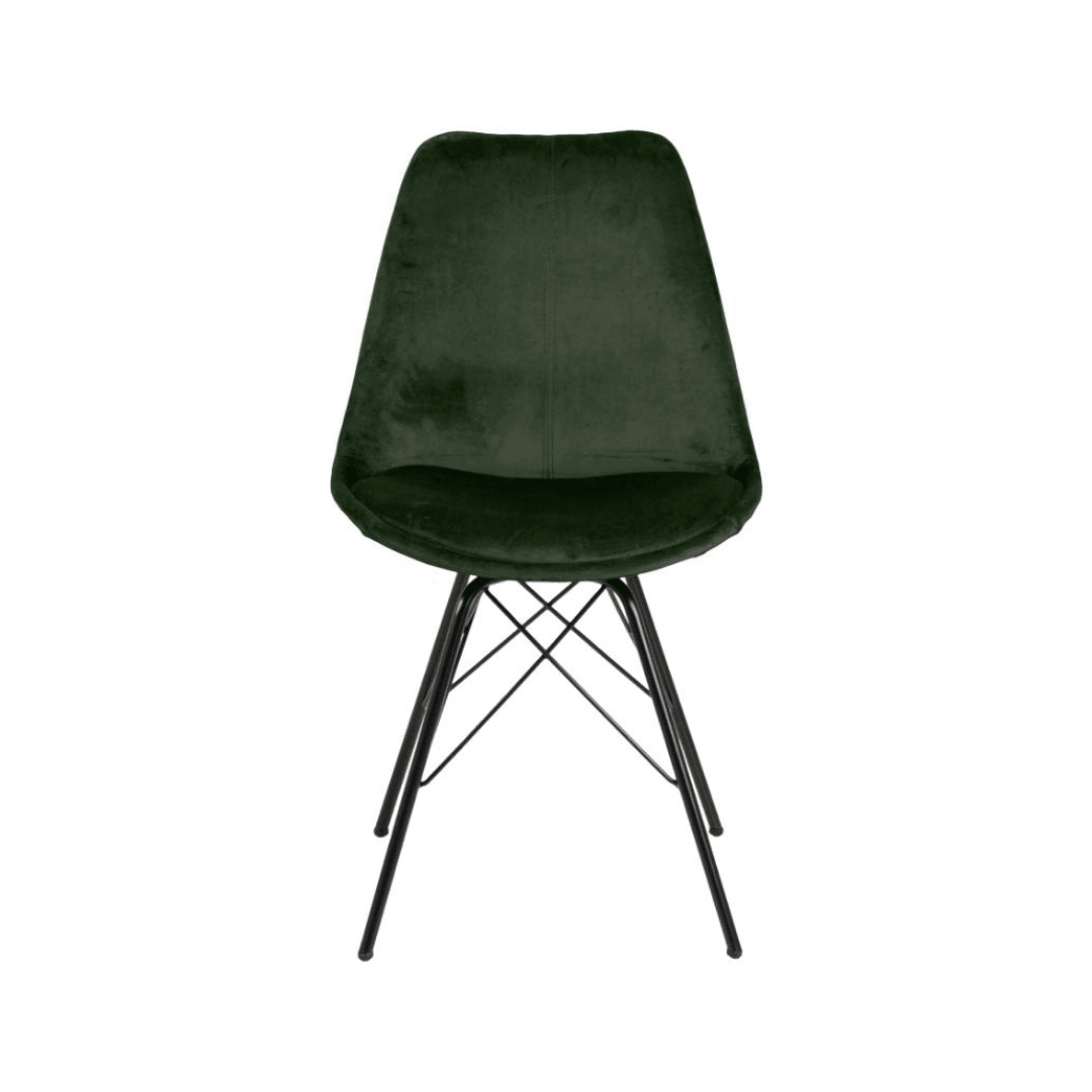 Express your sense of style with the elegant and timeless Eris dining chair. The organically shaped seat comfortably follows the natural curve of the backrest, helping to maintain good posture, while the cushion provides a soft seat. The chair is supported by black metal legs that complement the stylish look of the velvet fabric. The Eris chair is available in pink, dark grey, navy blue, beige and dark green.