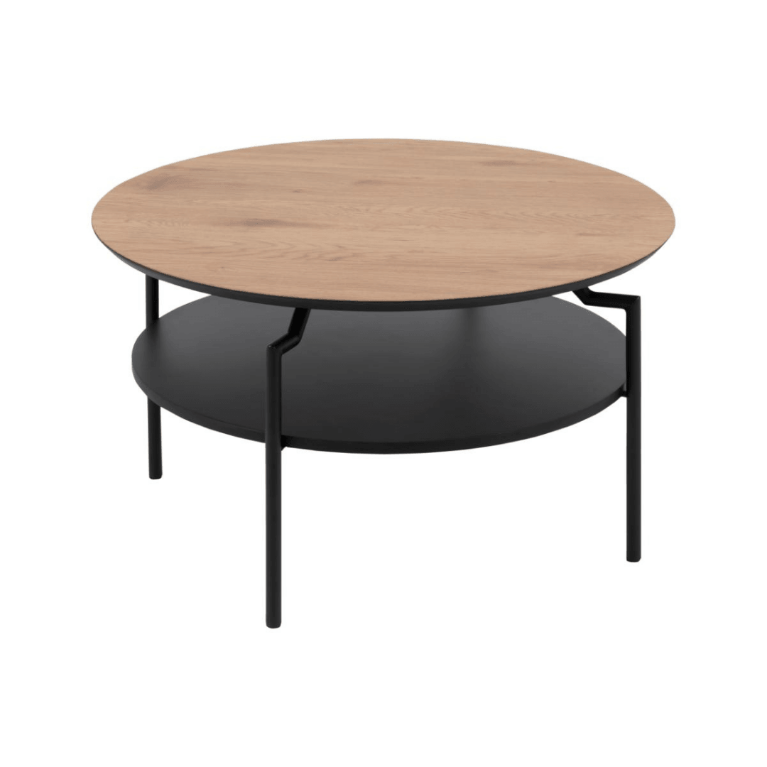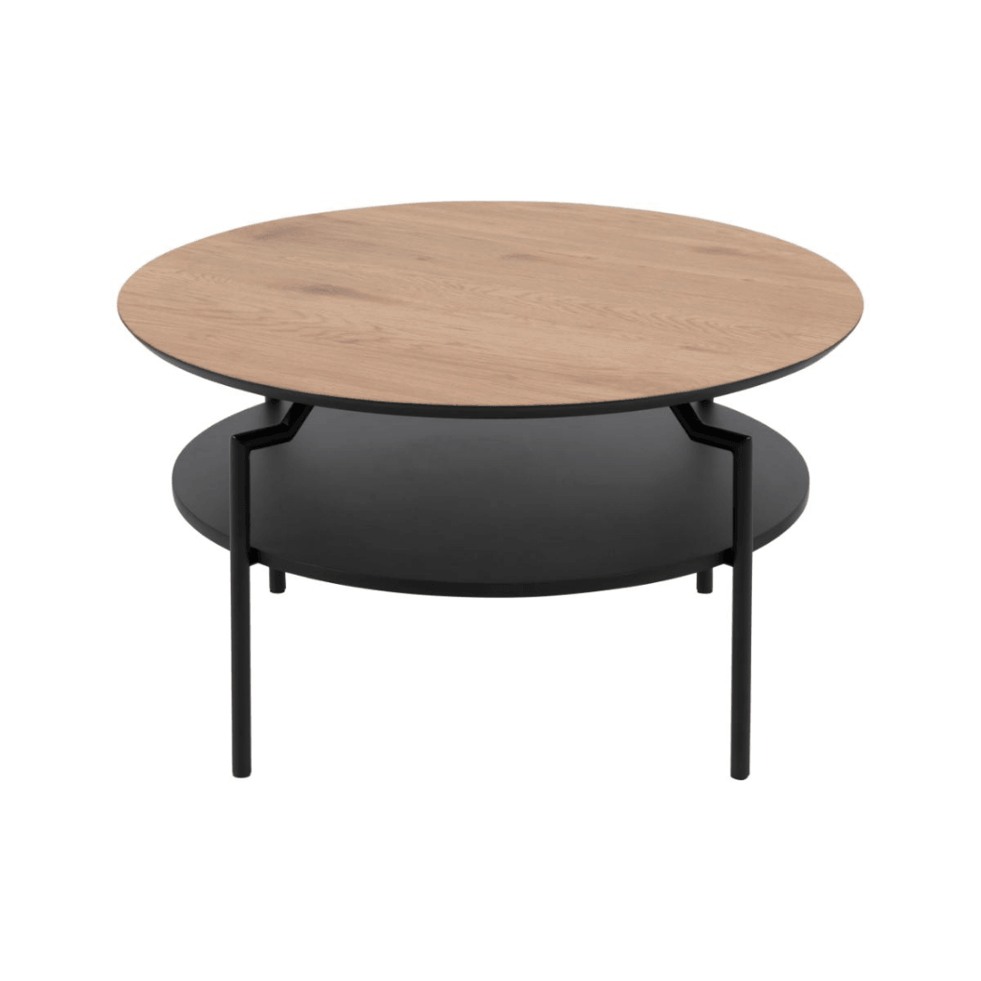 Meet the Goldington coffee table, a modern design that will make your room feel spacious. The thin tabletop and shelf are attached to a slim black metal frame. Despite its lightweight appearance, the table is made of durable materials, including rough powder-coated metal and solid wood panels in a wild oak look.