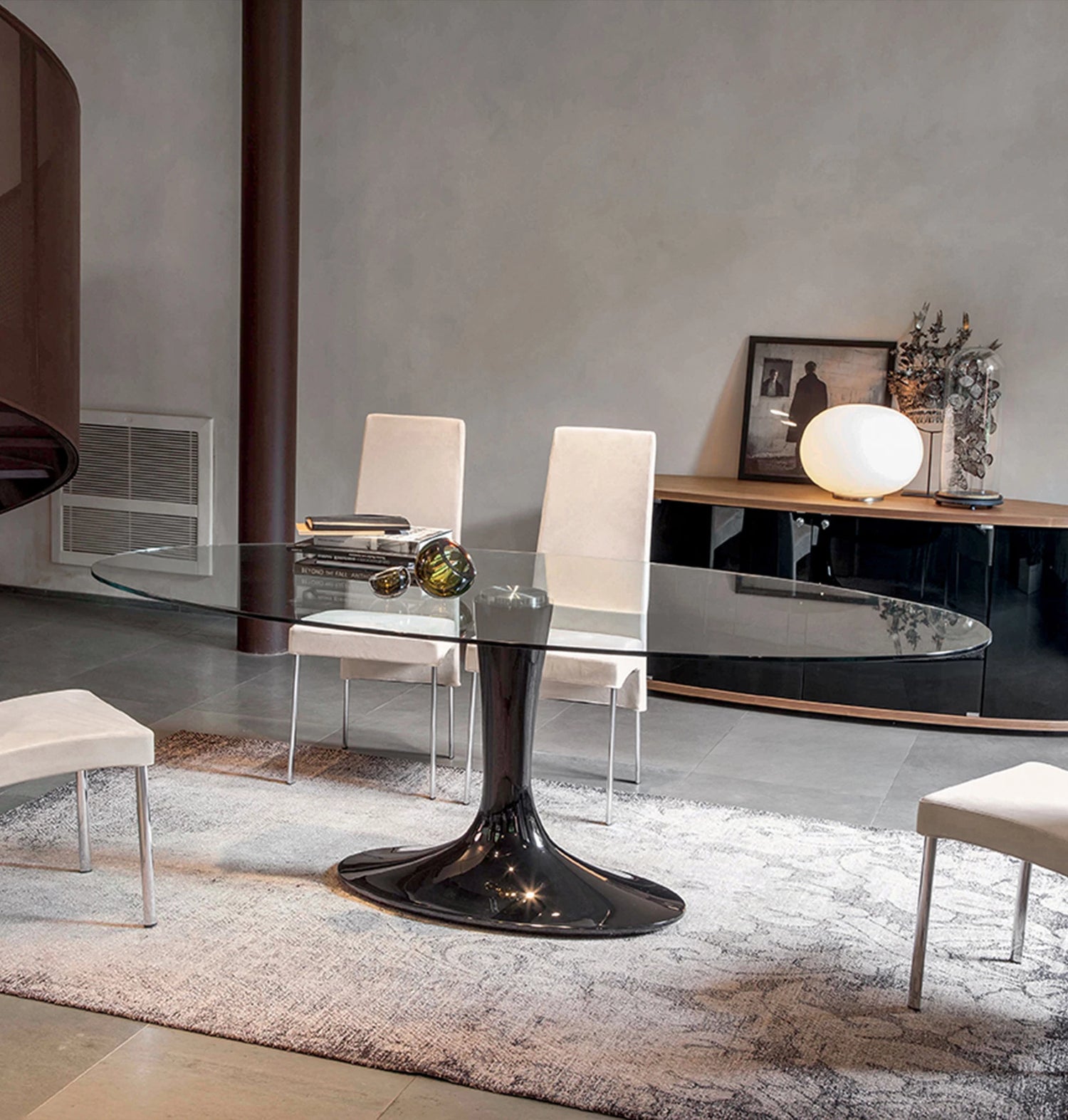 The Imperial table's design strikes a perfect balance between empty space and material. The base's glossy, glossy marble top shines through the tempered glass top. It can be individually configured to your needs with a variety of table tops and plinths. Available sizes: 105x180x75 / 105x200x75 / 120x220x75 / 55x100x75 cm.
