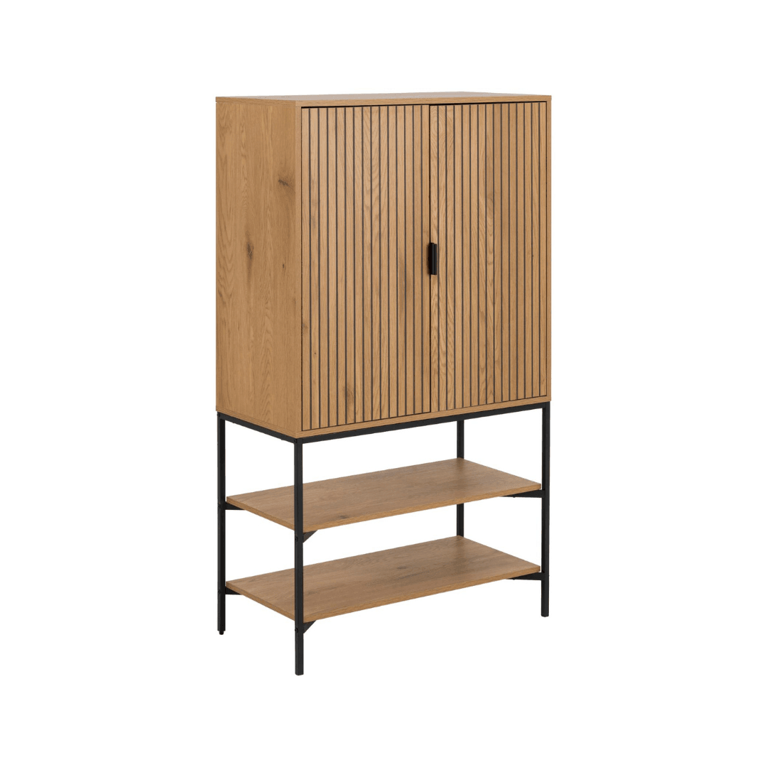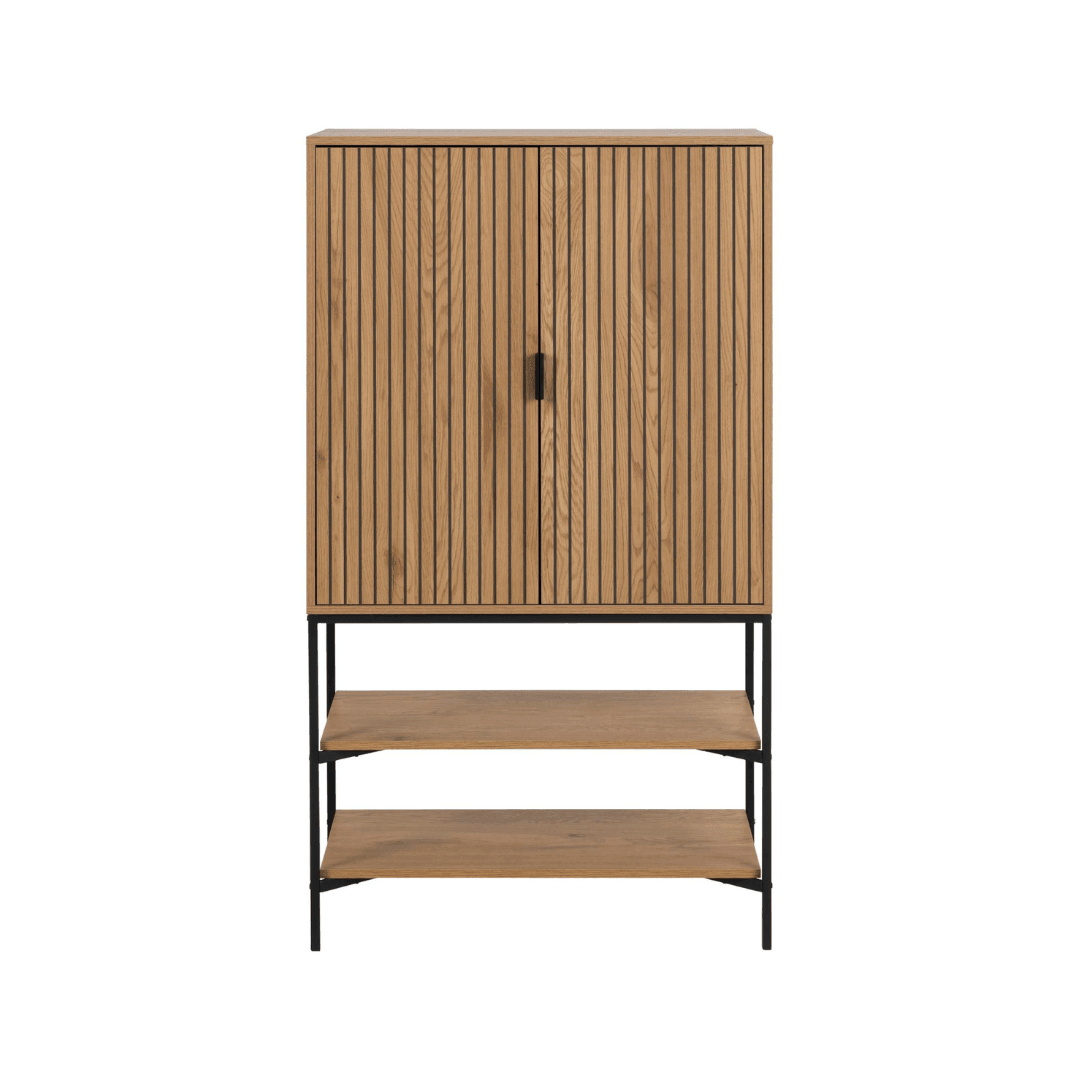 With its minimalist design, the Jaipur cabinet is more than just a place to store your things, it's also a statement piece. The oak look and lattice front combined with the black steel handles and frame create a modern, contrasting look for any home. The cabinet has two doors and three shelves, offering convenient storage with an easy-to-clean surface.