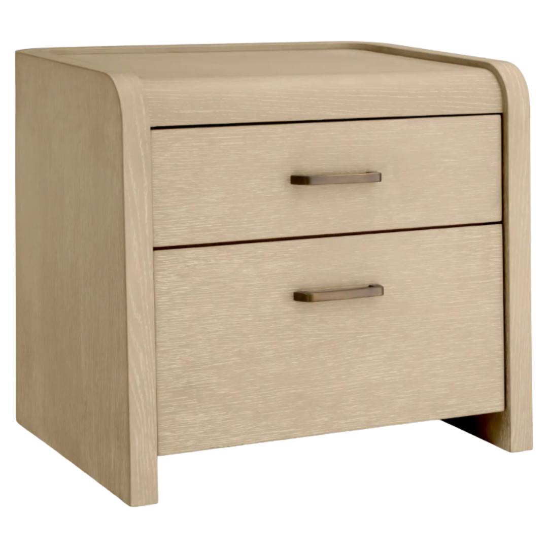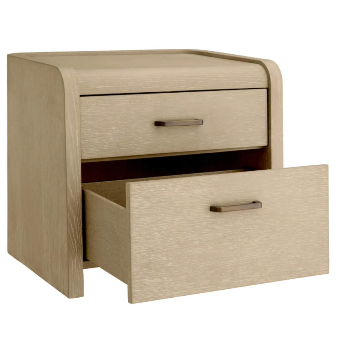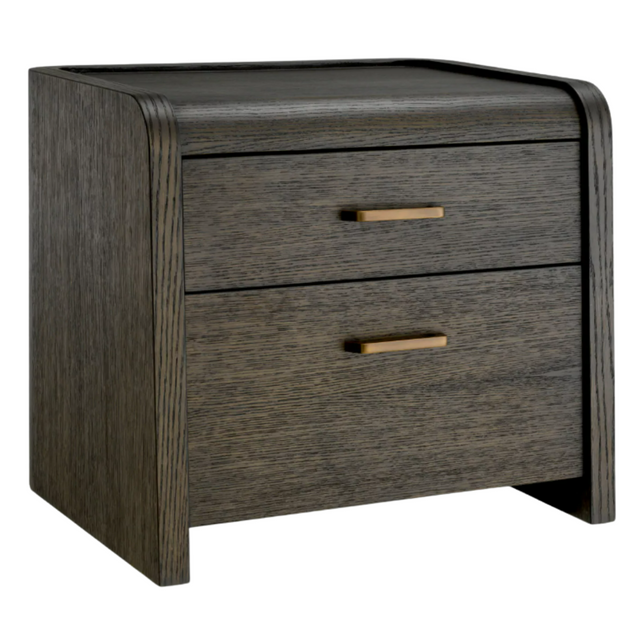 Fedezd fel a Joane éjjeliszekrényt csábító mokka vagy natúr kivitelű tölgyfa furnérban, ahol az elegancia és a használati érték találkozik. Karcsú kontúrjai és kifinomult bronz fényezése kifinomultságot sugároz, míg két tágas, Soft-Close rendszerrel záródó fiókja elegáns tárolást kínál. Tökéletes azok számára, akik értékelik a visszafogott luxust a belső terekben.