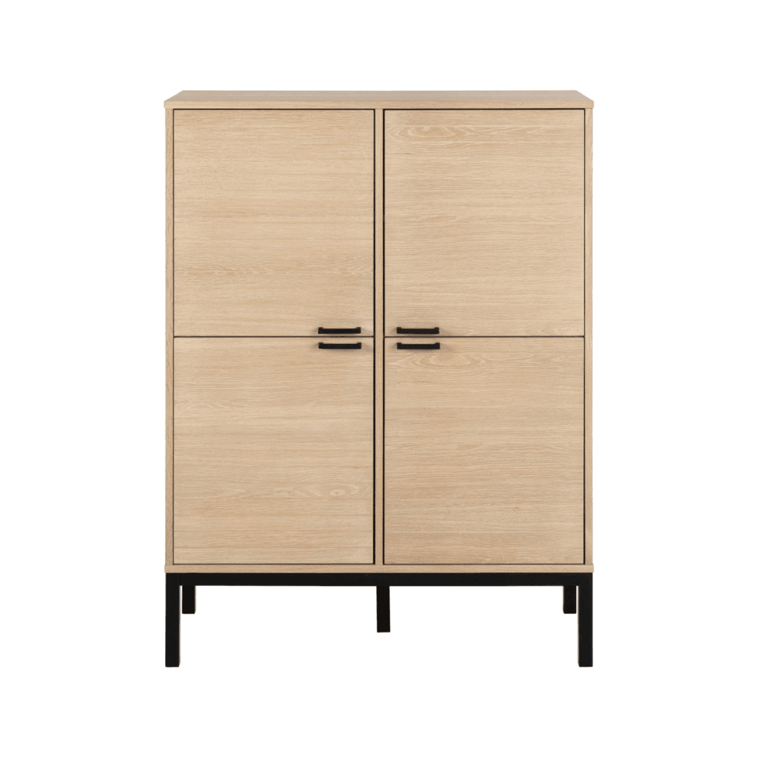 Kensington is a striking cabinet that brings a fresh and natural energy to the interior. With its contrasting appearance achieved by mixing white pigmented oiled oak veneer with black lacquered metal legs, the cabinet enhances the dynamics of the room. It is designed with six adjustable shelves, which are hidden behind four decorative doors.