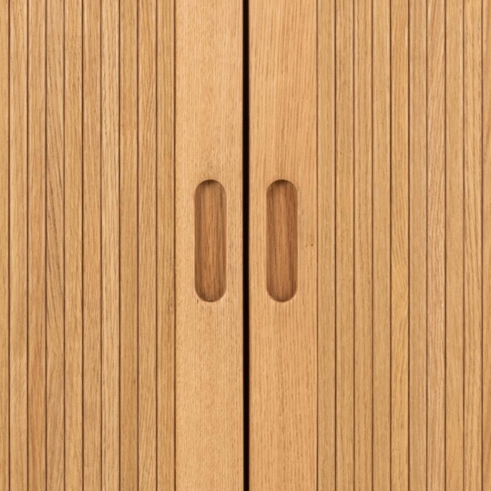 Elevate the look of your home with this wooden Langley cabinet. The rectangular cabinet with rounded corners combines modern and natural aesthetics to suit a variety of interior styles. The slatted decoration, soft character and lacquered oak wood characterize the wardrobe's distinctive look. Inside, there is a spacious shelf and a hanging storage space.