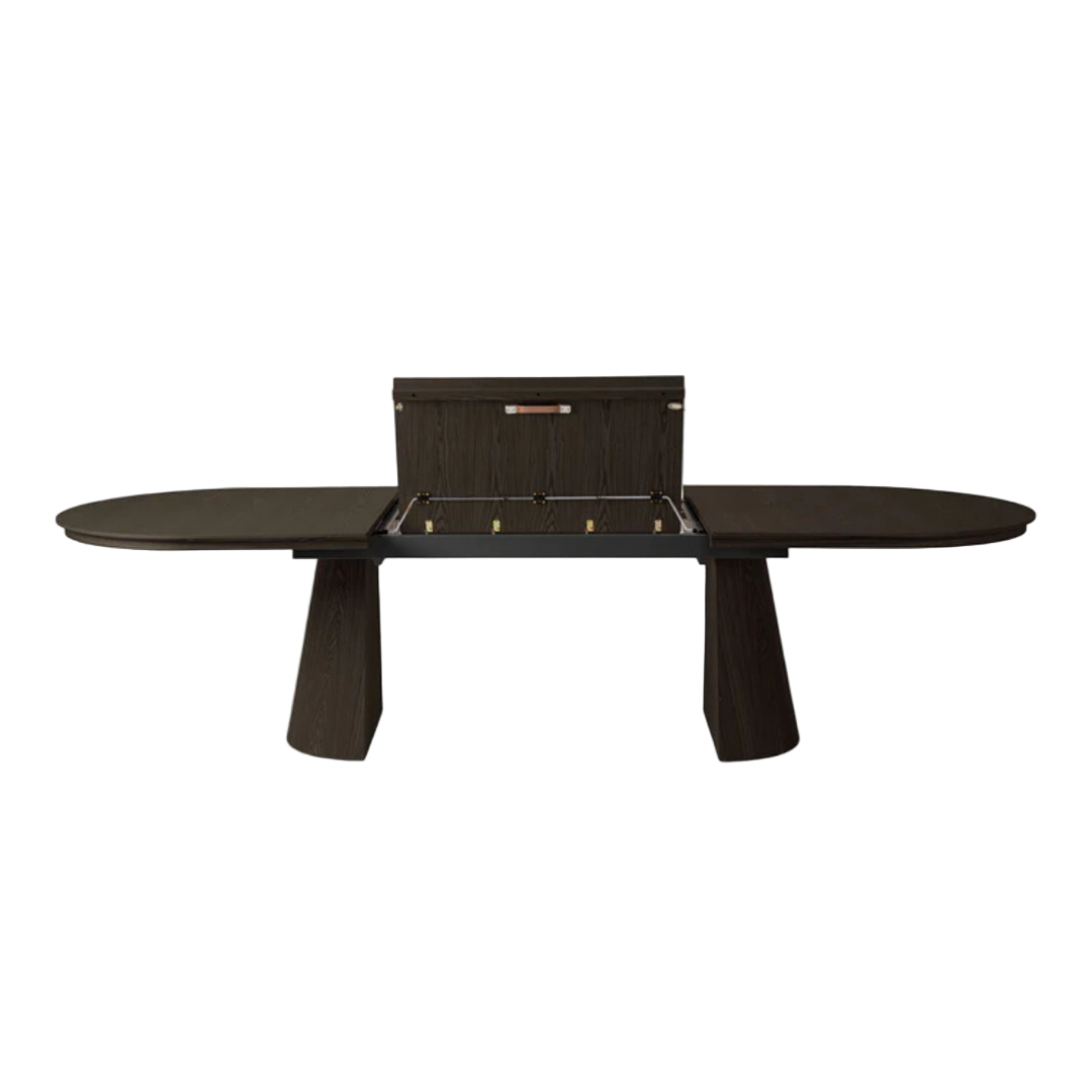 The Mana dining table is the perfect solution for everyday use or special occasions. It can comfortably accommodate a large family, as its extendable top provides additional surface area, increasing from 200 cm to a maximum of 300 cm. The rounded corners and beveled edges of the table top give the table a subtle elegance and sophistication. The model is supported by two semicircular columns with vertical ribs that provide stability and balance. You can choose from several veneer colors to match your interior.