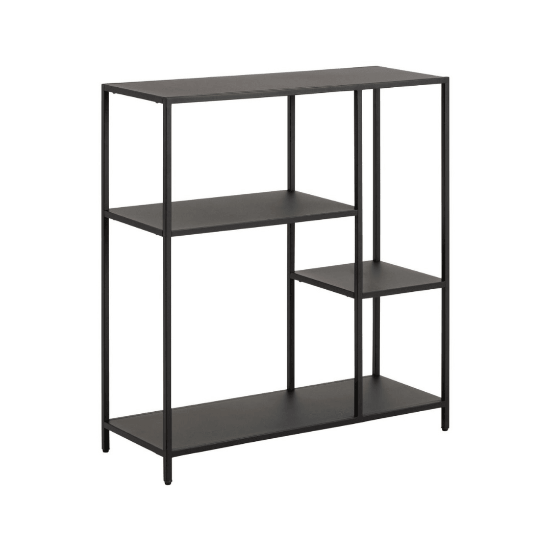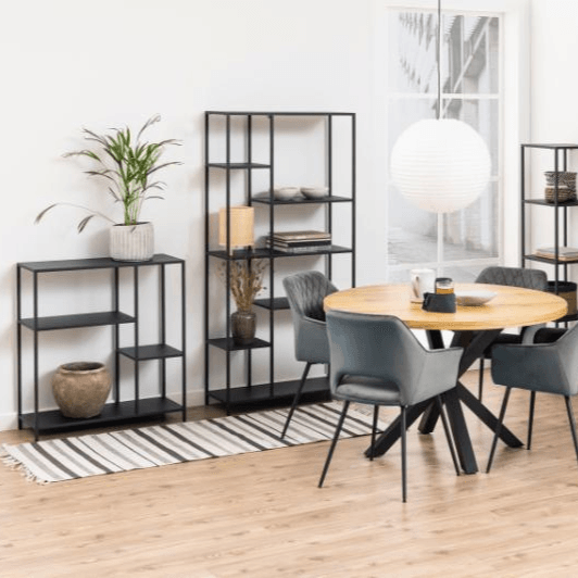 Create an industrial feel in your home with the Newcastle black metal shelf. Notice how the asymmetrical style of the shelves gives the room a modern feel. Using Newcastle is a great way to refresh your living room while also providing practical storage for your books and decorations.