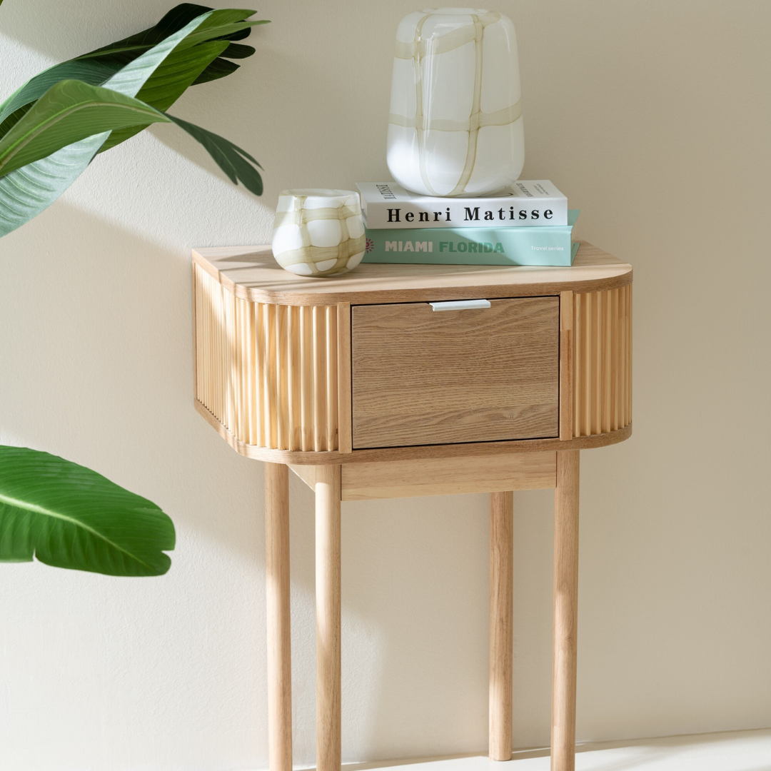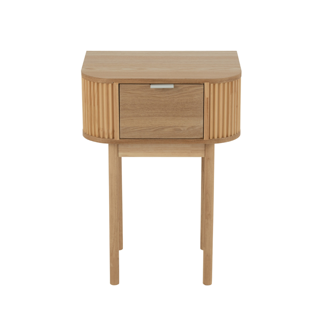 Az Olive kollekció éjjeliszekrénye a modern otthonok tökéletes kiegészítője. Natúr színű fenyőből készült, amely nemcsak tartós, hanem természetes szépséget is sugároz. A bordás oldalelemek egyedi megjelenést kölcsönöznek, ezáltal a bútordarab nemcsak funkcionális, hanem esztétikus is. A praktikus fiók lehetővé teszi, hogy a szükséges dolgokat rendezetten tárolhasd, így mindig kéznél lesznek az éjszakai használatra szánt tárgyak.