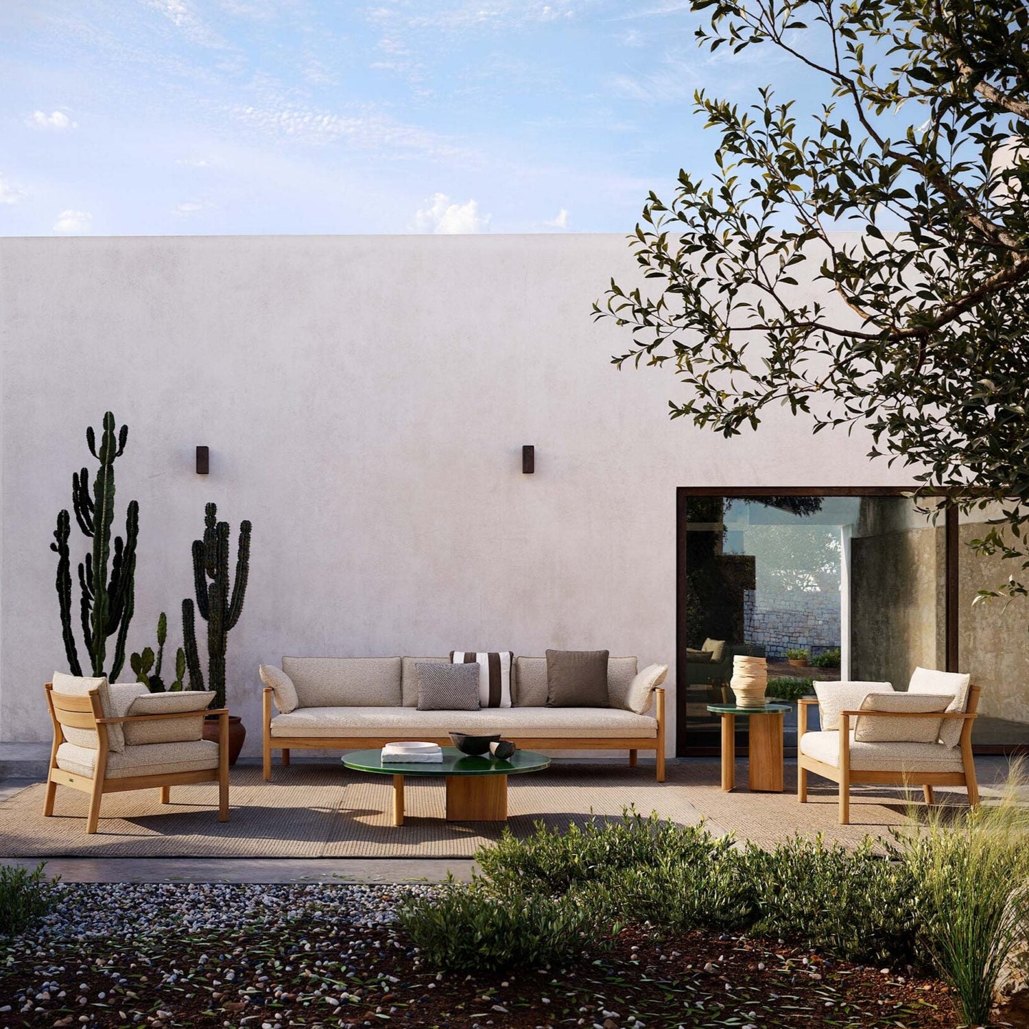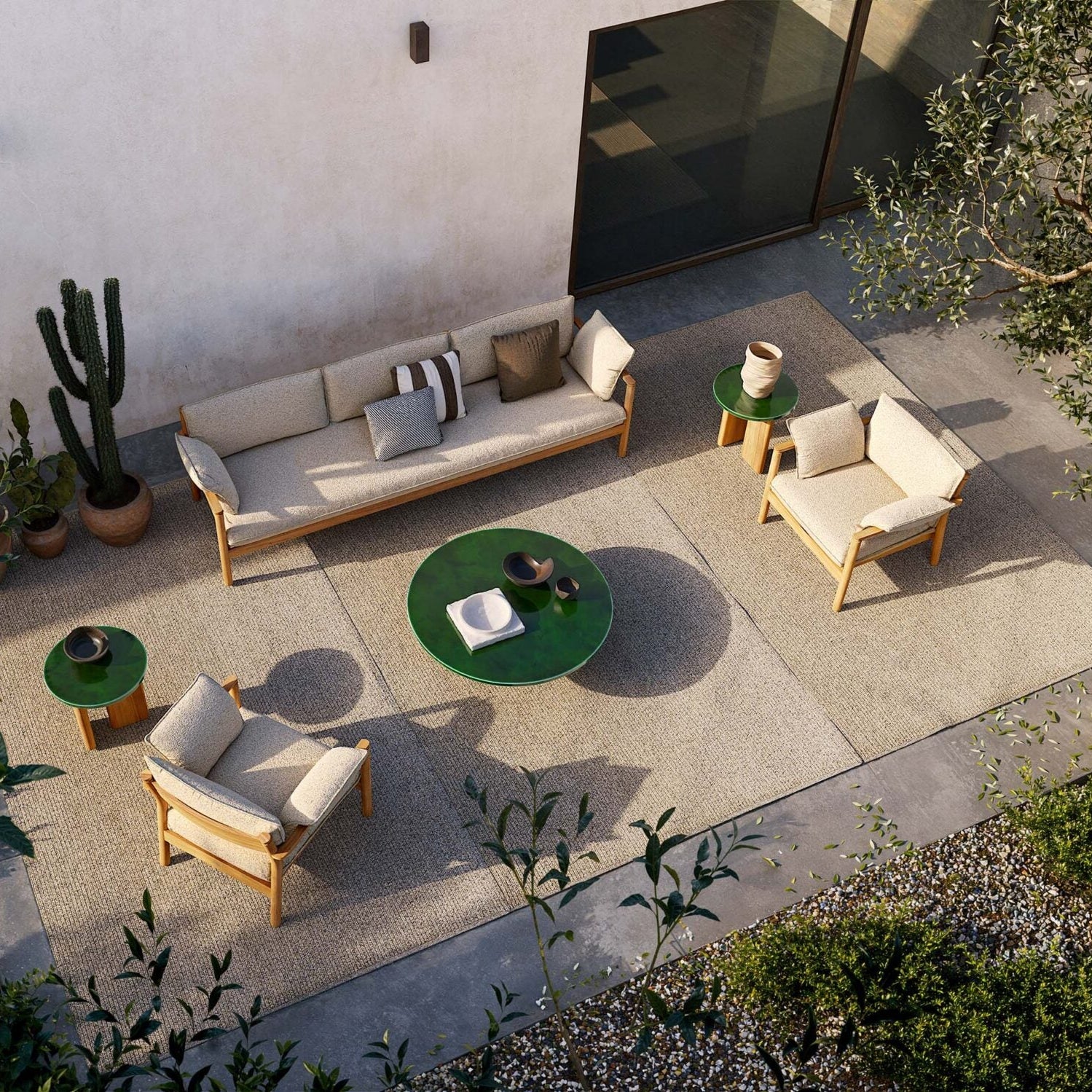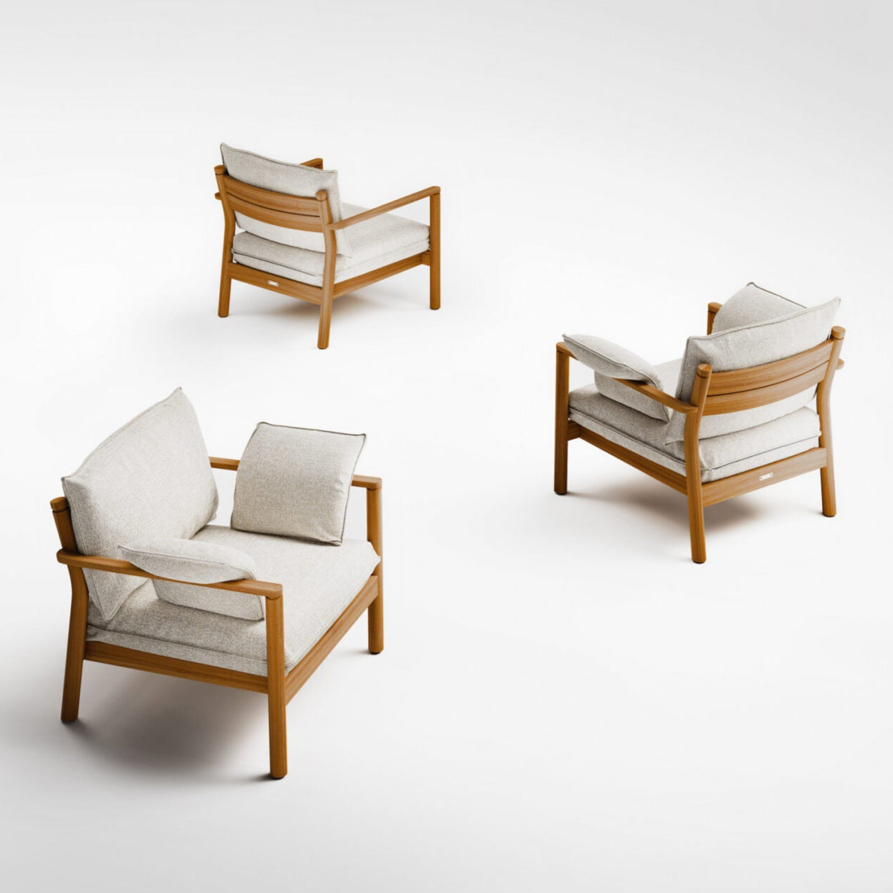 The Panama collection is distinguished by its cylindrical teak structure, reinforced by a groove that makes this unique detail even more characteristic. The linearity of the structure perfectly matches the softness of the cushions, which give the collection a contemporary and sophisticated character.