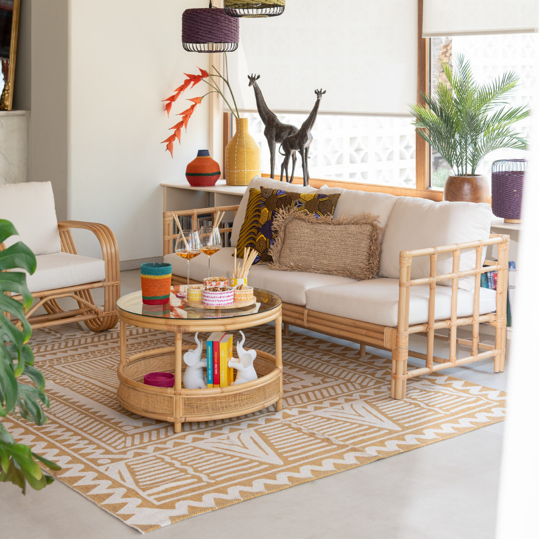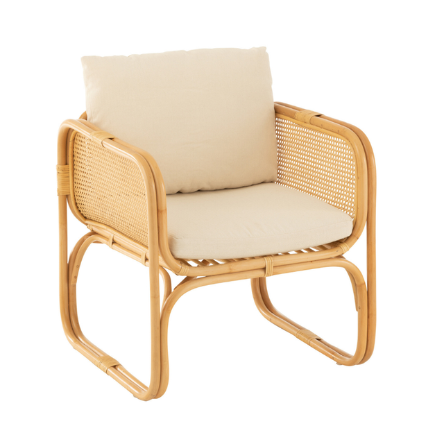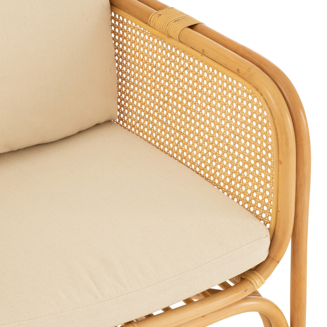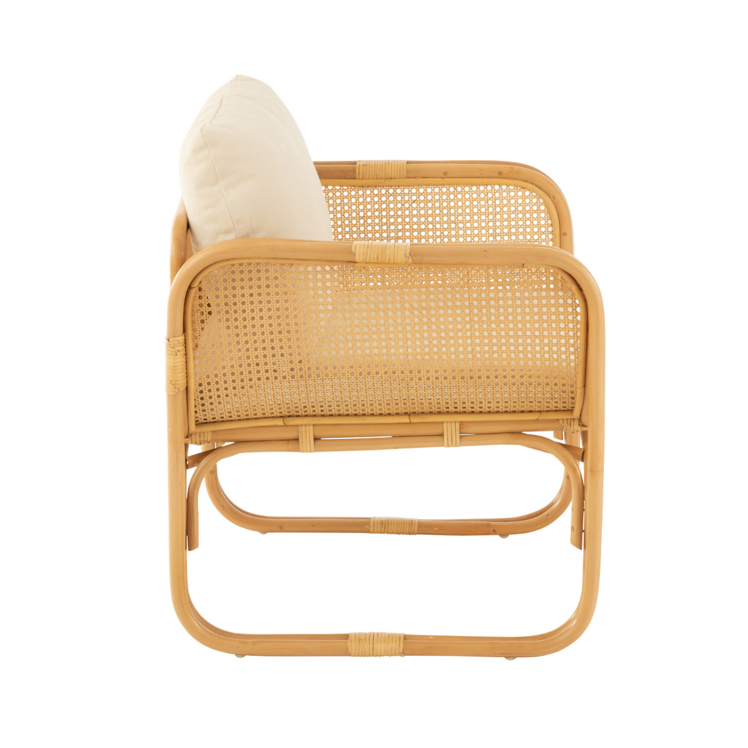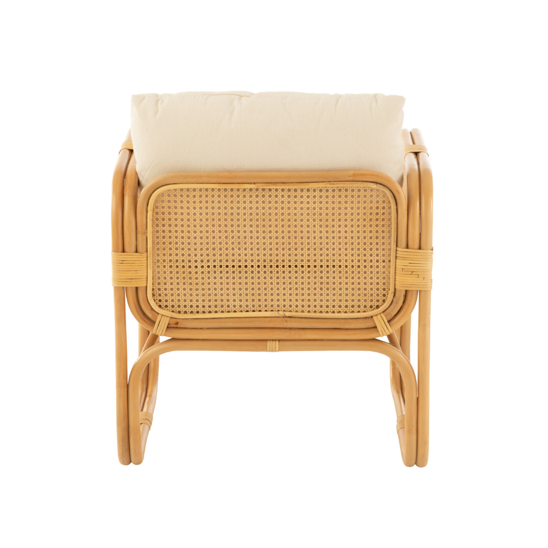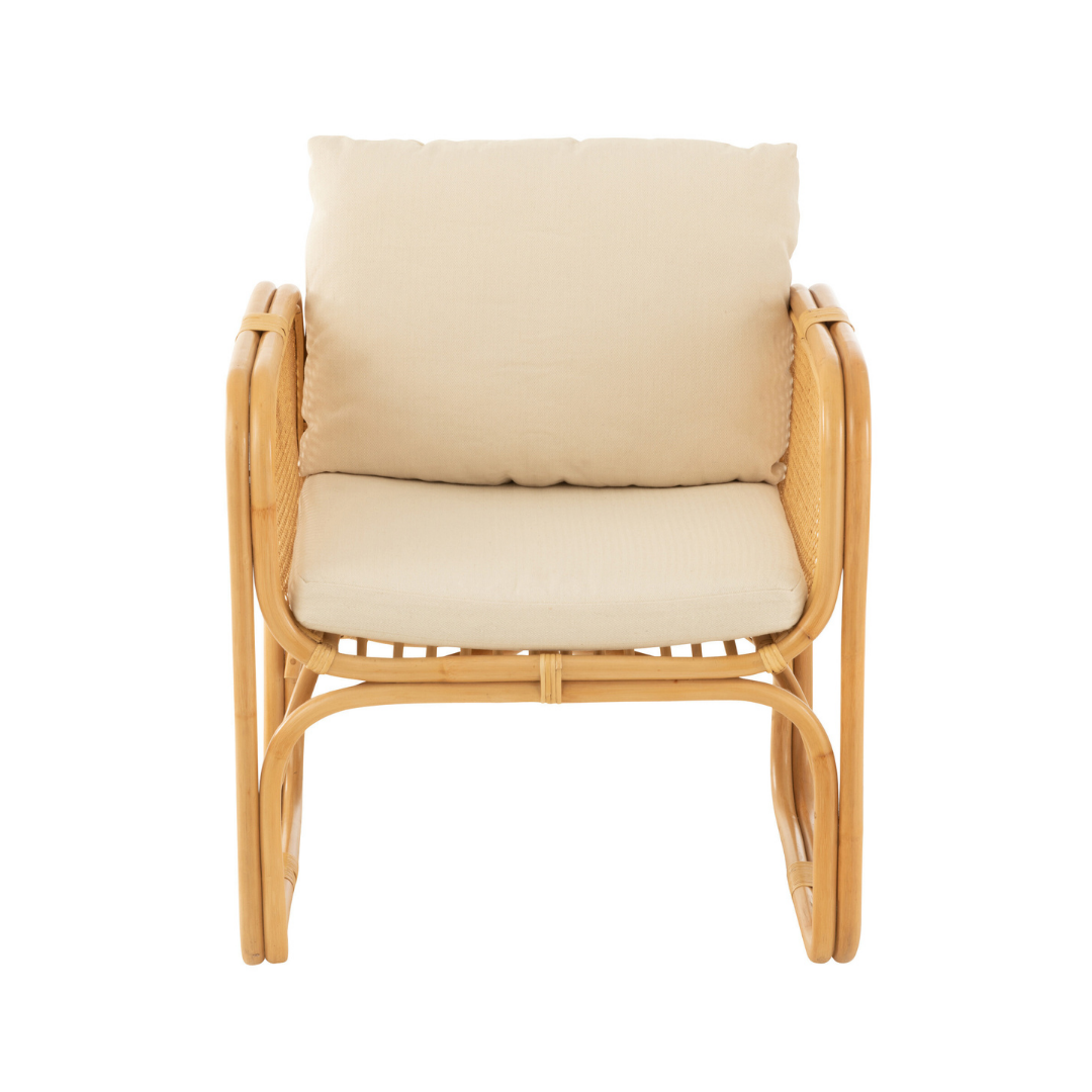 A Safari fotel egy elegáns és stílusos bútordarab, amely a természetes anyagok szépségét és funkcionalitását ötvözi, így könnyedén illeszkedik bármely belső térbe. A szék vázát masszív fa és elegáns rattan alkotja, amely nemcsak tartósságot, hanem egyedi megjelenést is biztosít, míg a vastag, bézs színű párnák kényelmes használatot nyújtanak.