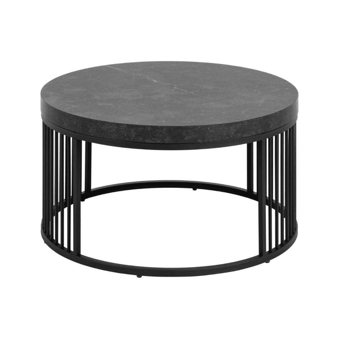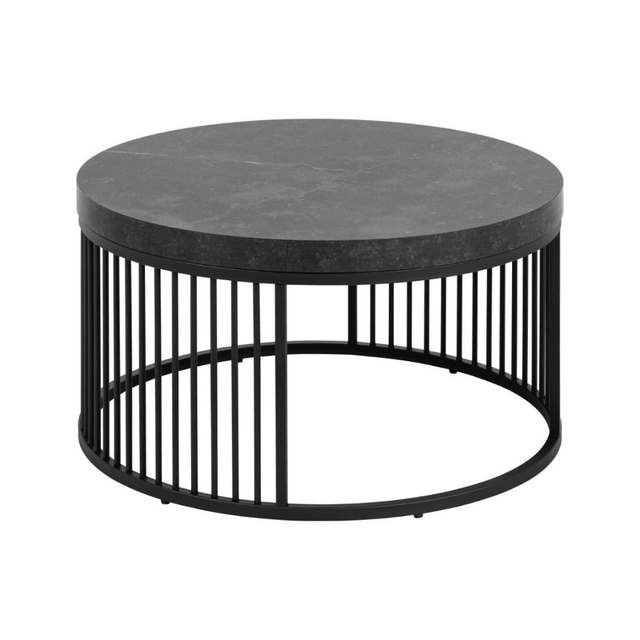 The round Strington coffee table stands out from the crowd with striking details that give it a distinctive look. The bold round top is finished in a black marble look and is set in a black steel frame with vertical slats. The combination creates a stylish contrast between the two elements.