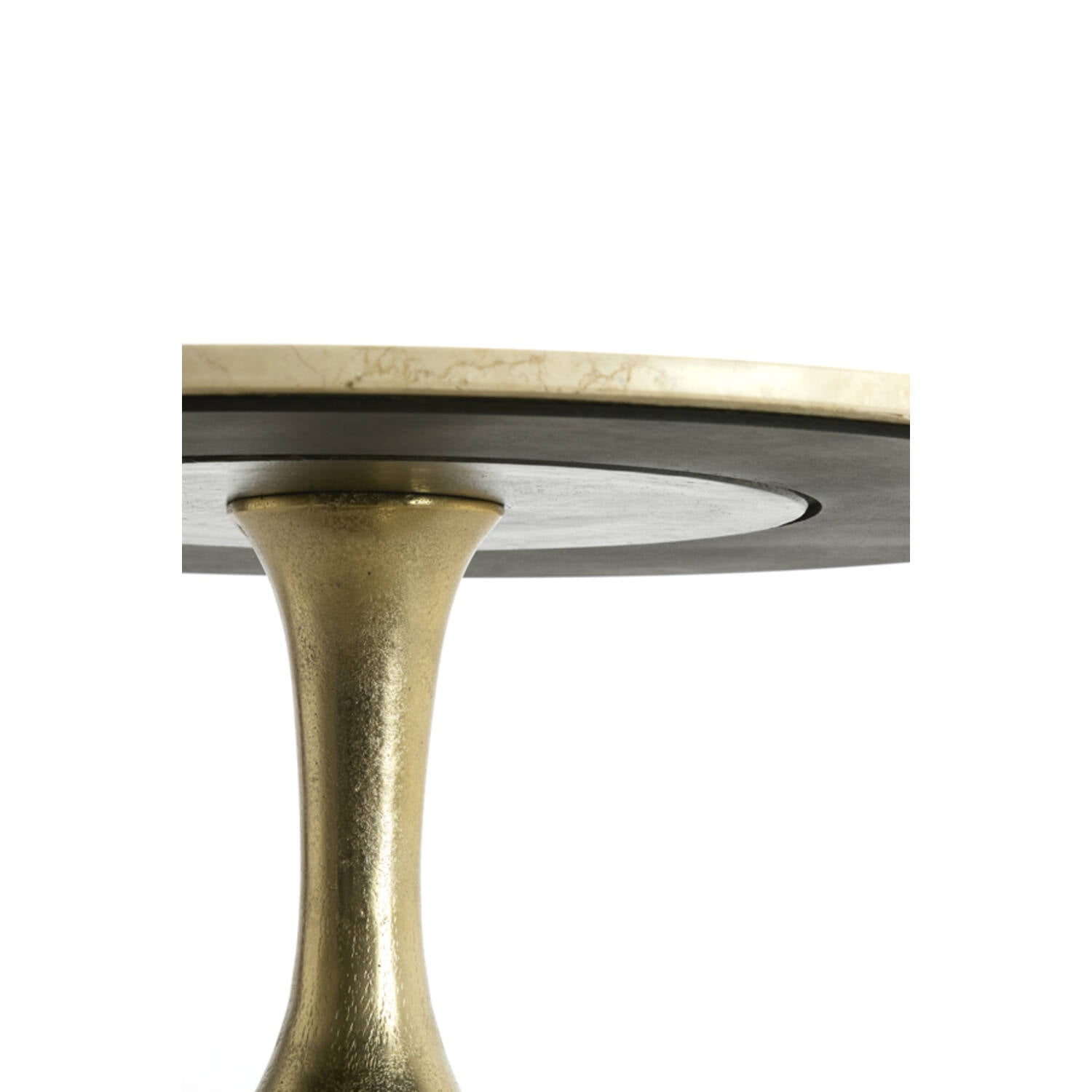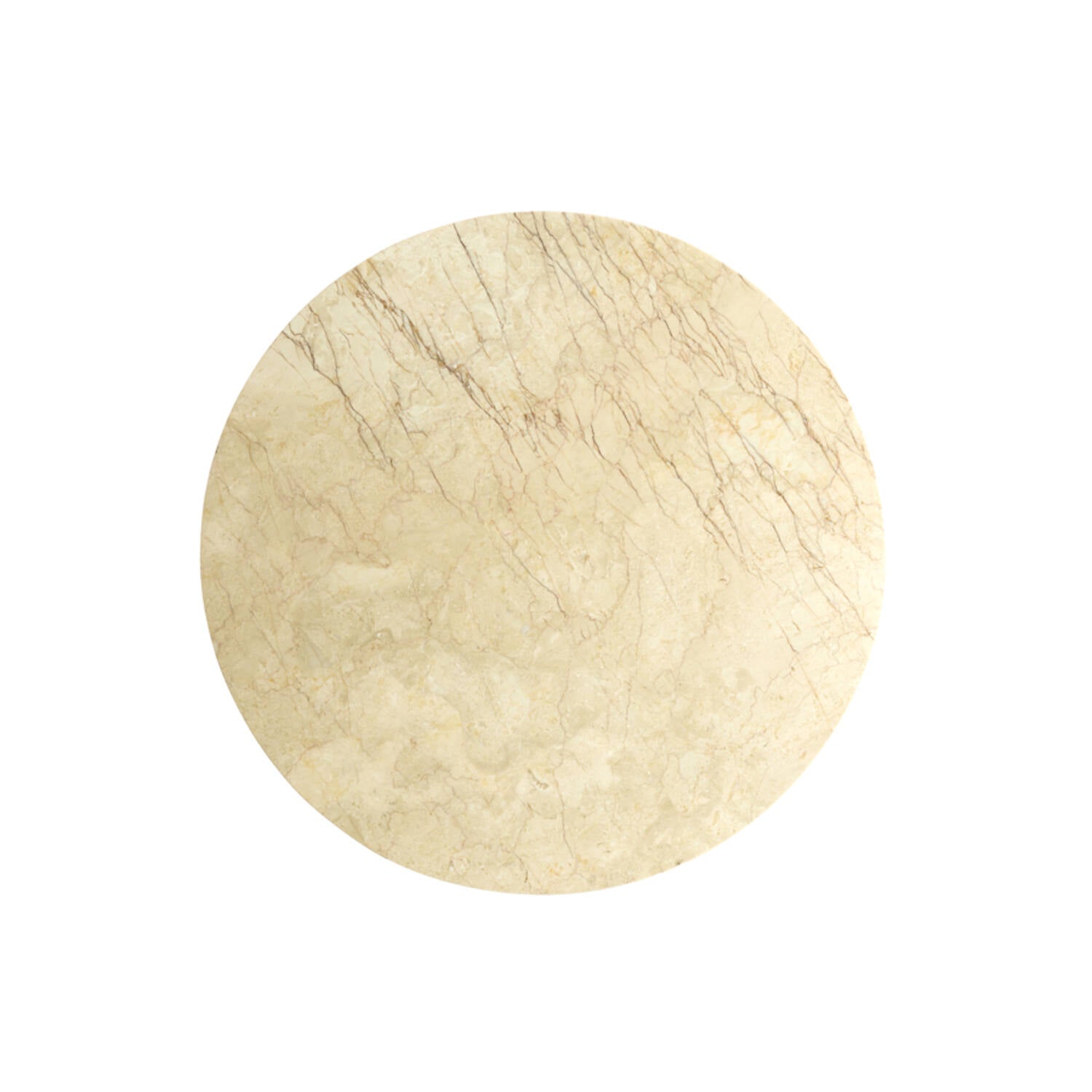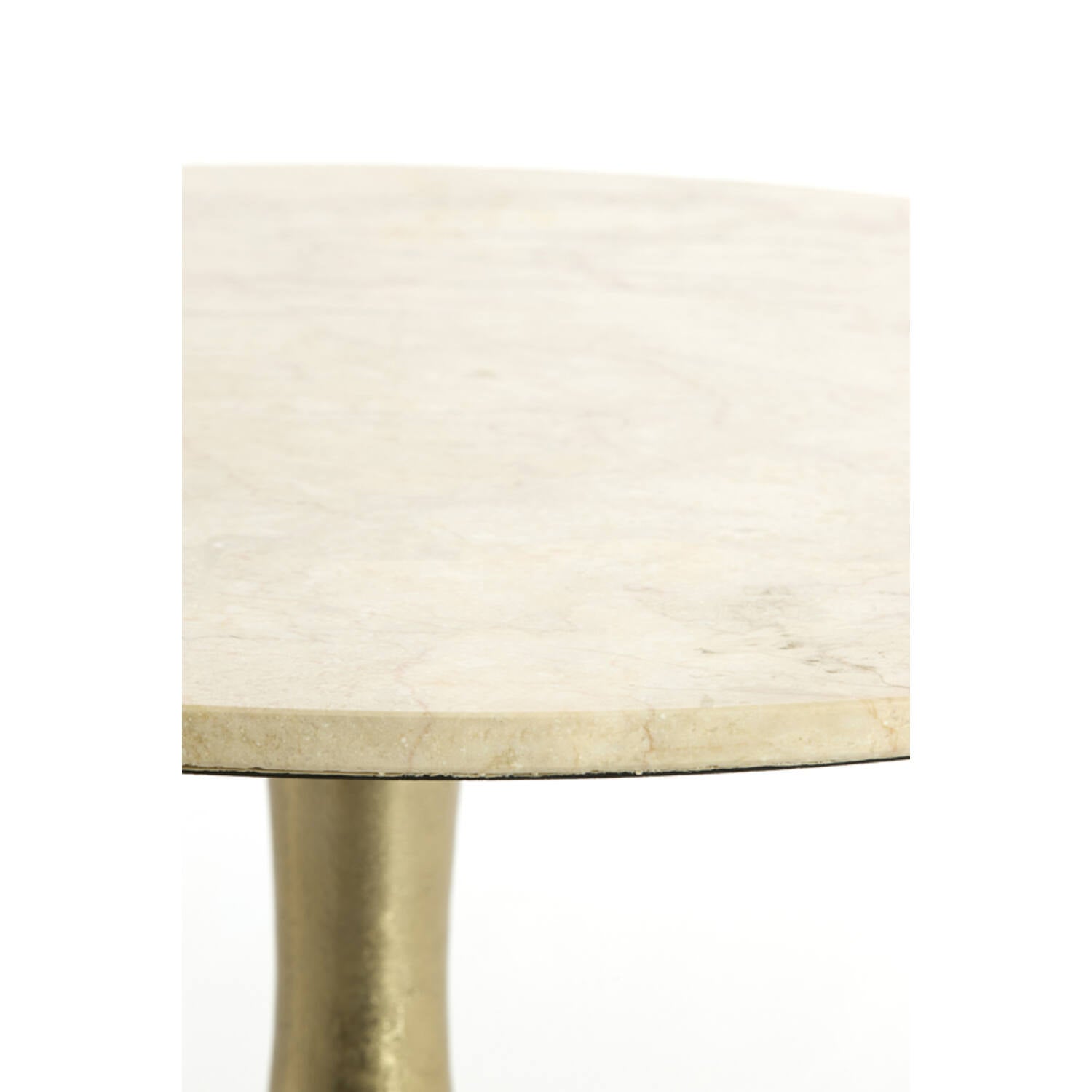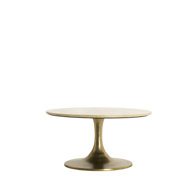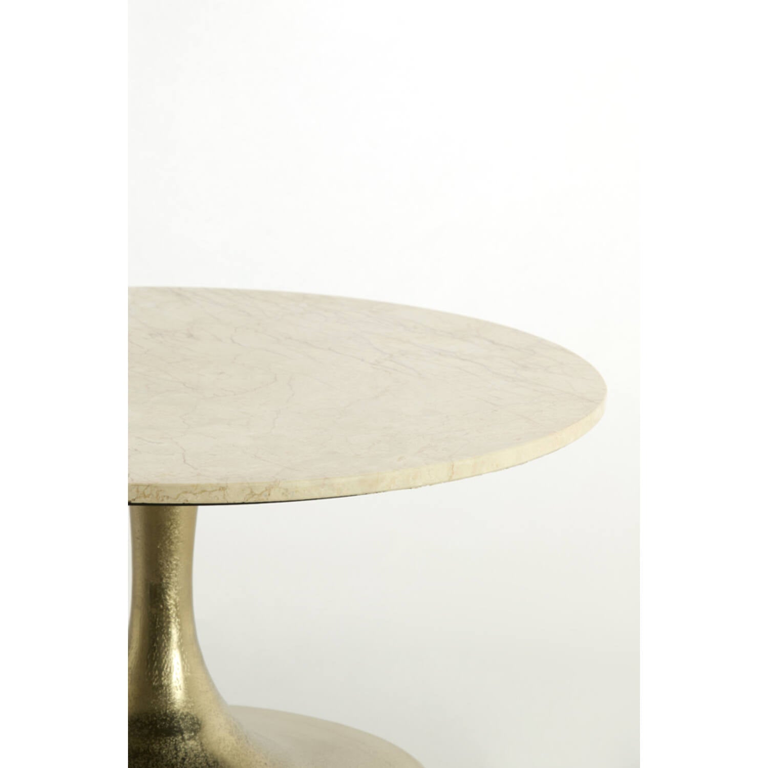 A Tomar asztal a prémium anyaghasználatával hívja fel magára a figyelmet. A nagyméretű, 74 cm átmérőjű asztallap természetes kőből (márványból) készült, amelynek egyedi homok-rózsaszín árnyalata minden darabot megismételhetetlenné tesz. A márvány hűvös eleganciáját tökéletesen ellensúlyozza a könnyed, világos arany tónusú fém váz, amely stabil tartást és légies megjelenést biztosít a bútornak. Alacsony, 36 cm-es magassága miatt ideális választás kanapék mellé vagy dohányzóasztalként egy stílusos pihenősarokba.