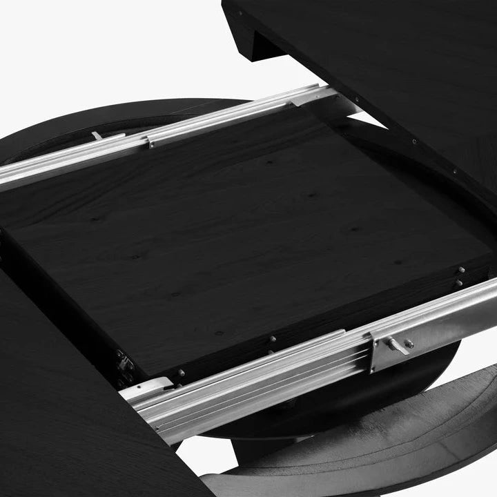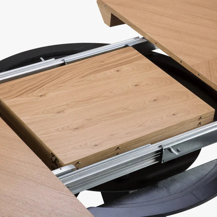 If you are looking for a functional piece of furniture for your dining room, then the Toni extendable dining table is perfect for you. The round, 120 cm table top can be extended to 220 cm, making it perfect for smaller kitchens or spacious dining rooms. The black metal base has spider legs and a unique diagonal cut edge. Available in natural or black, and also available in a 130 cm diameter.