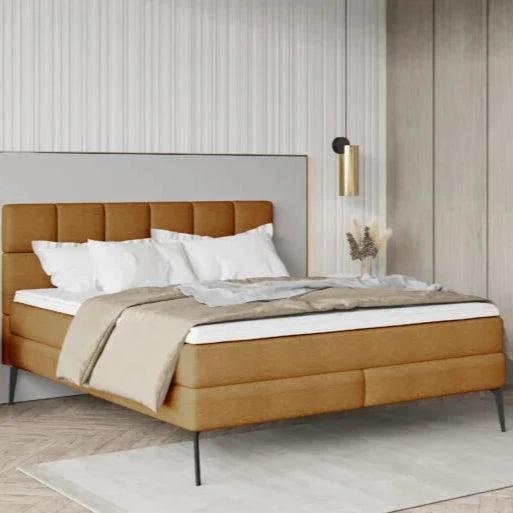 Az Adel franciaágy egy elegáns mégis letisztult bútor, amelyet egyszerű, de érdekes fejtámla jellemez. A függőleges és vízszintes varrás sakktábla-mintázatban van elrendezve, amely magával ragadja a tekintetet. A konstrukcióban használt bonnell matrac kényelmes alvást, a magas fekete lábak pedig könnyedséget adnak a dizájnnak.