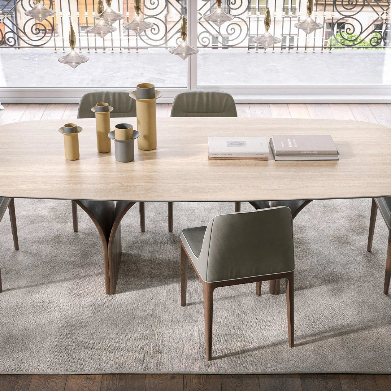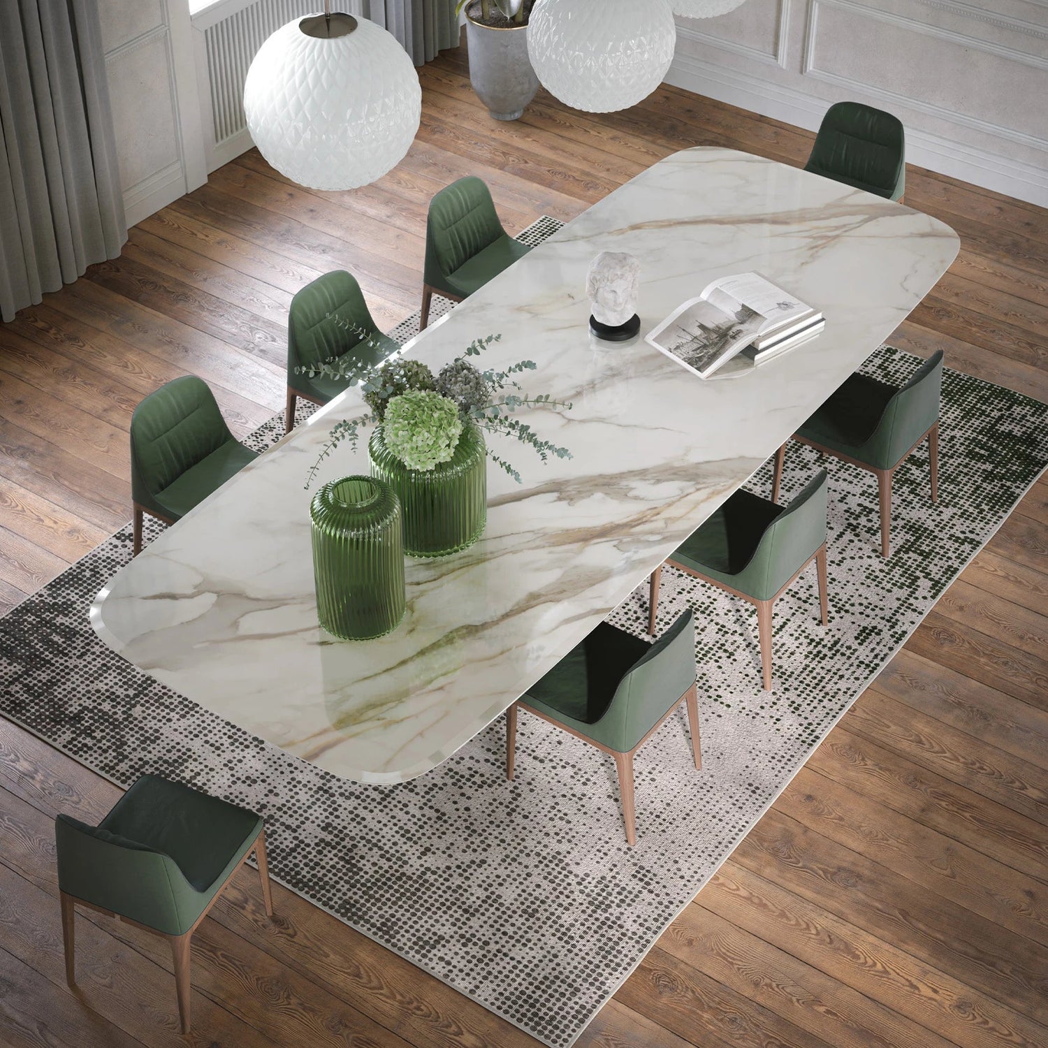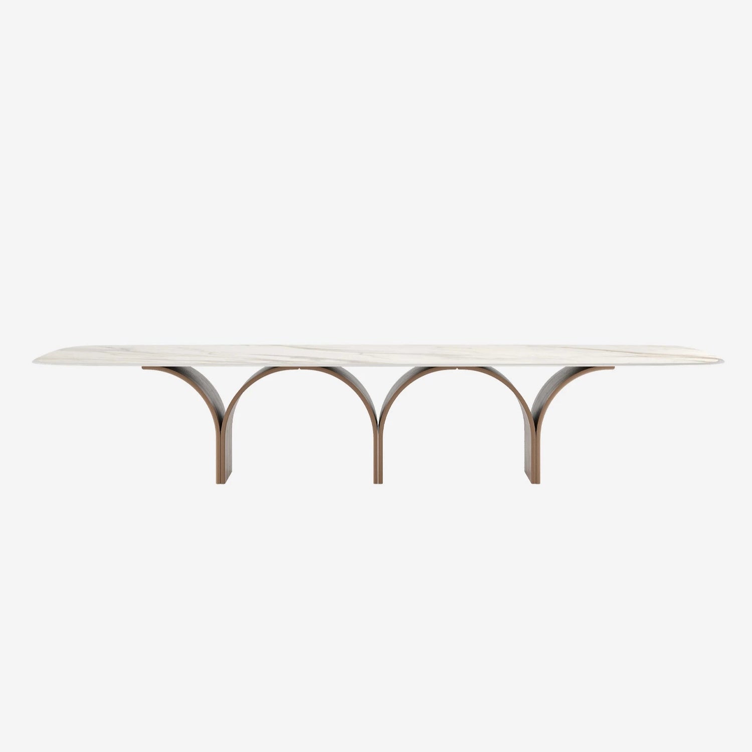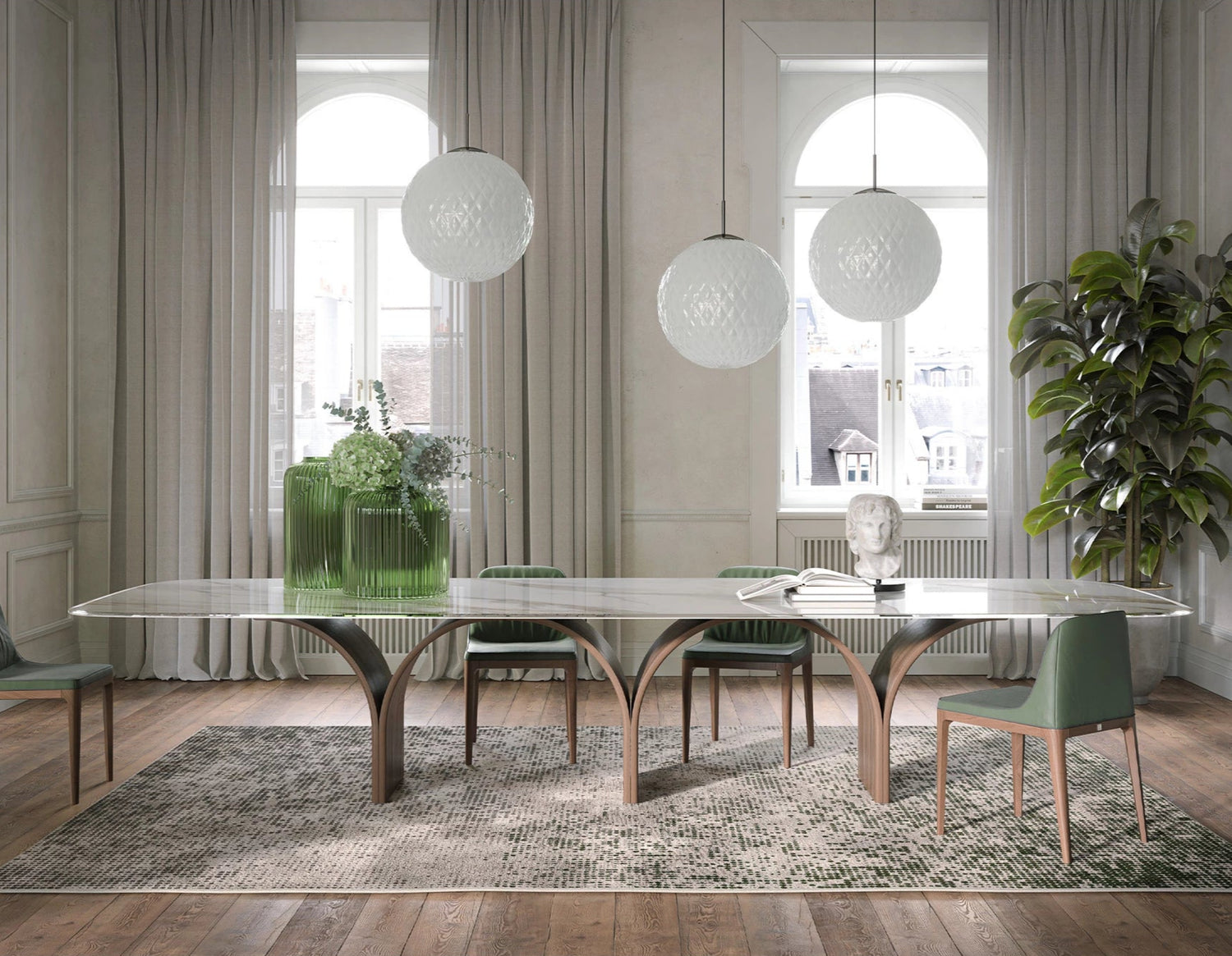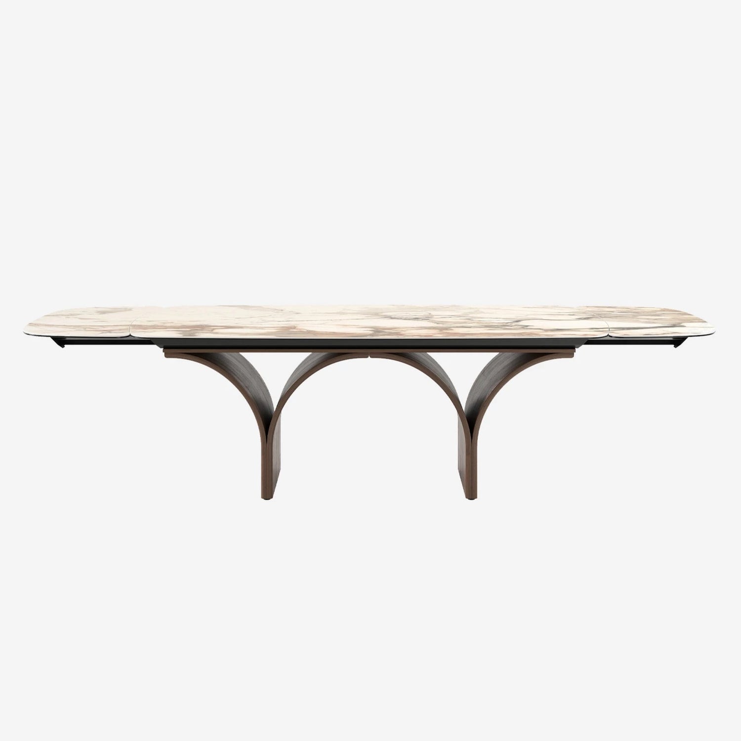 Finom, ívelt falábak támasztják az Arco asztalt, amely különböző kivitelekben elérhető. Egy nagyszerű, egyensúlyt és harmóniát sugárzó dizájnelem, amely bármilyen környezetet eleganciával dob fel. Az asztallap különböző kivitelekben kapható: művészi üveg, porcelán, fa és márvány számtalan variációja. Elérhető méretek: 100x200x75 / 120x250x75 / 120x300x75 / 400x150x74 cm. A bővíthető kivitel mérete: 200-286x120x77 cm.