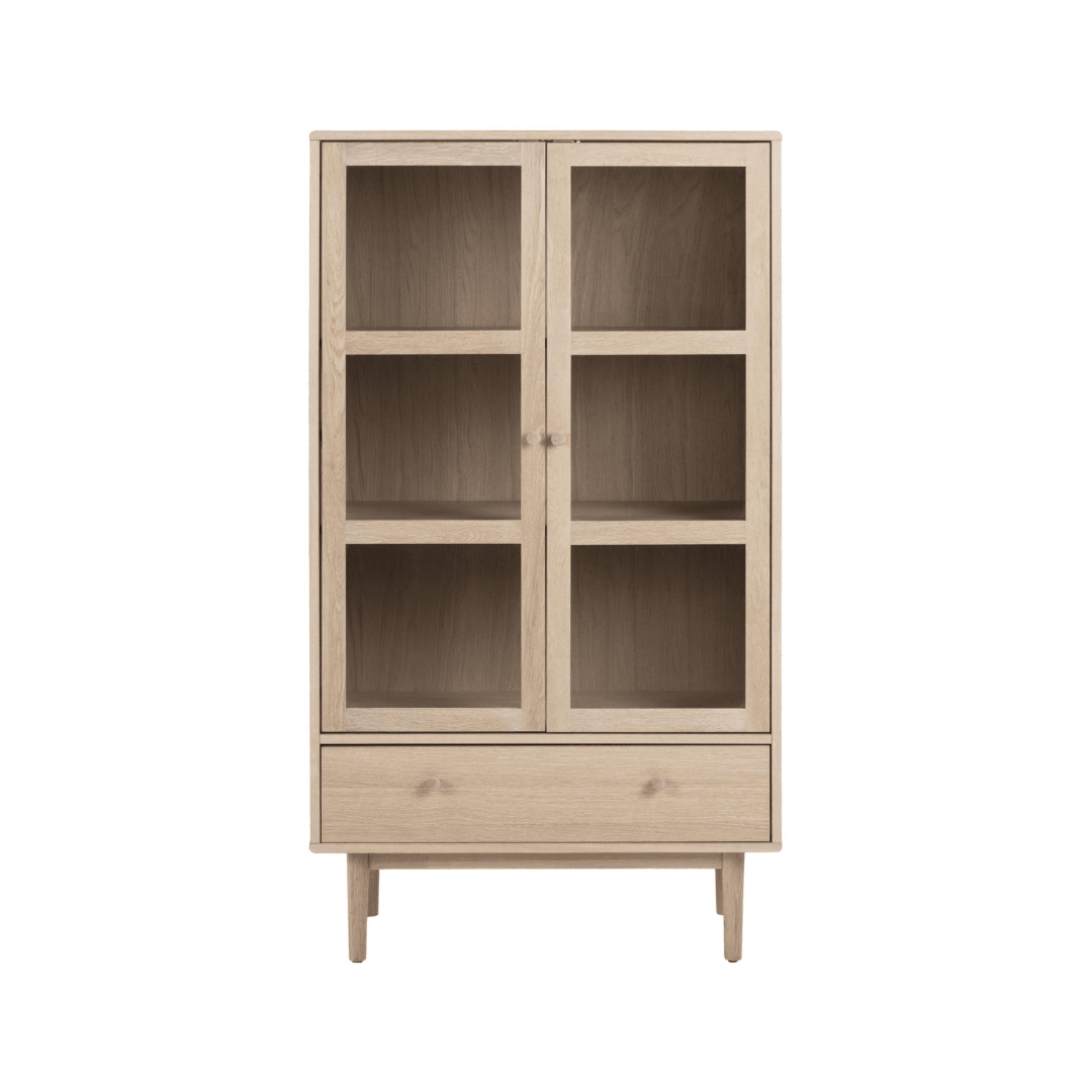 A tömör tölgyből és tölgy furnérból készült Aston kabinet kiváló választás, ha a természetes, és klasszikus skandináv dizájn híve vagy. Az üvegajtók mögött két polc található, amelyek szabadon hagyják a fiókot a kisebb tárgyak számára. Egyszerűen tökéletes, és praktikus tárolási megoldás minden belső térbe.