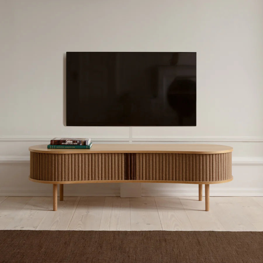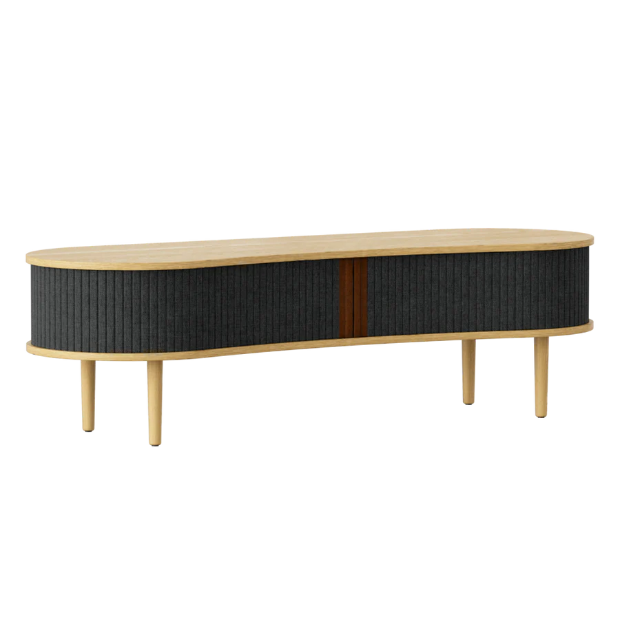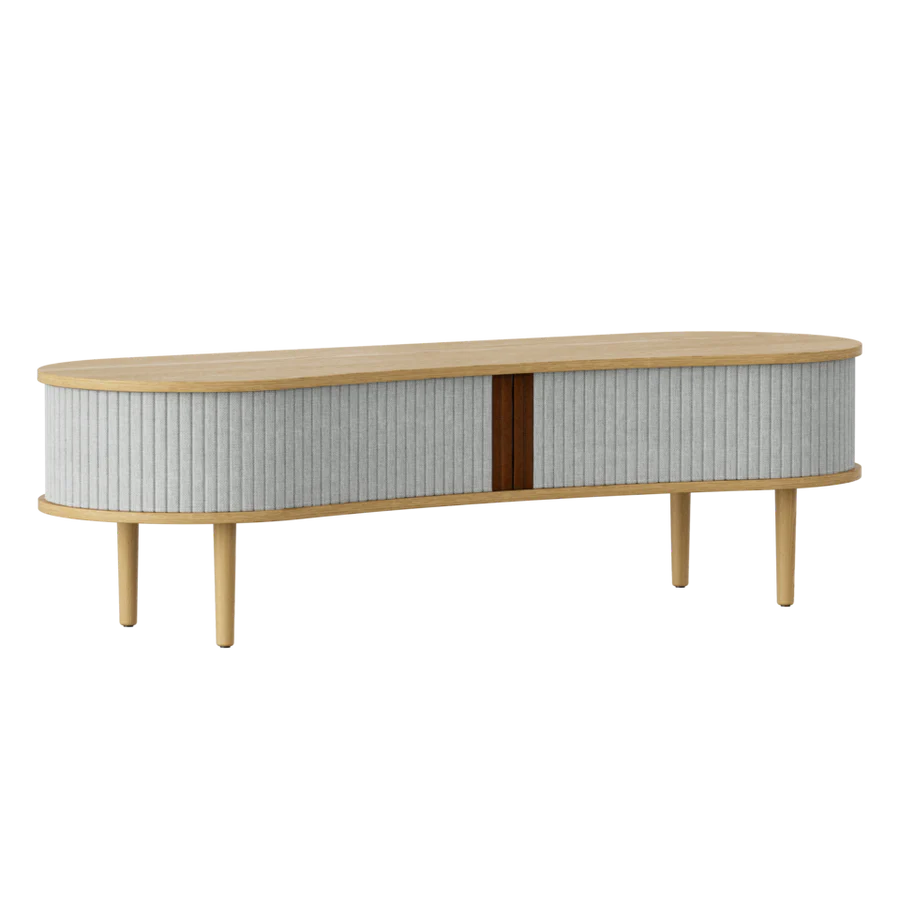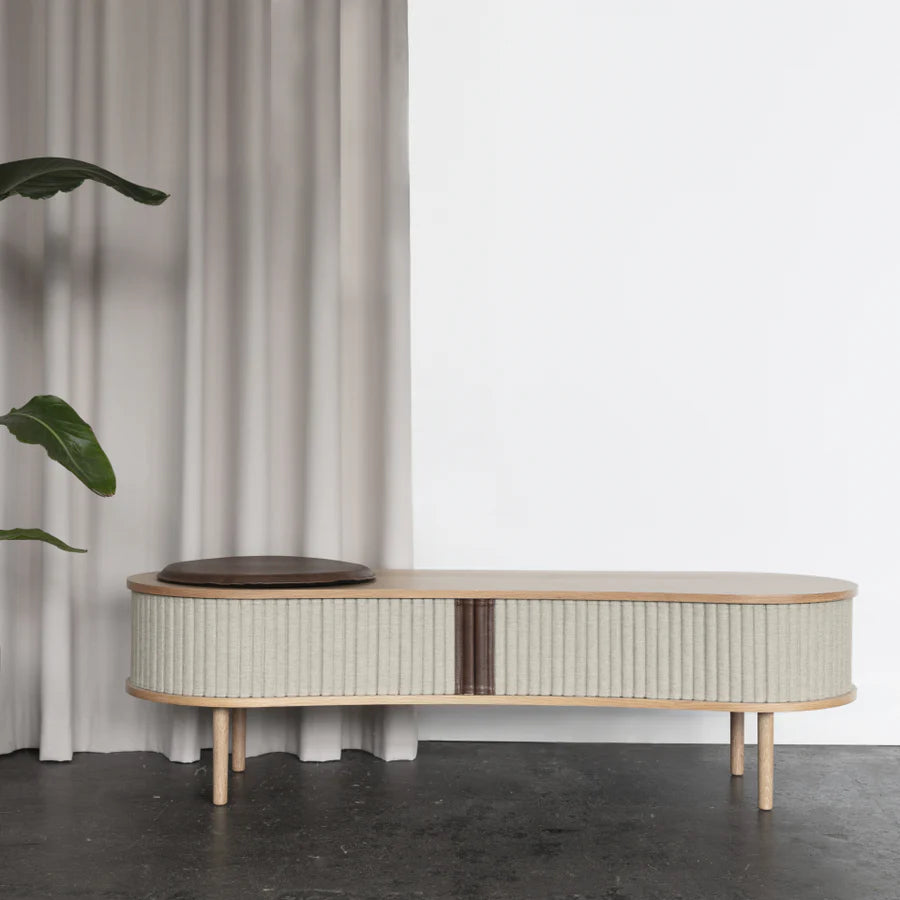 Többcélú pad ülőhelyként vagy TV szekrény, ez a sokoldalú Audacious dizájn bútor. A hátul található kábelkivezetéssel könnyen elrejtheted a kusza kábeleket. Az előszobában elhelyezve tárold az összes kültéri ruháját, cipődet miközben helyet is foglalhatsz. Tölgy, sötét tölgy és fekete tölgy színben kapható, tamburás ajtókkal, a 100%-ban újrahasznosított Horizons textil négy gondosan kiválasztott színében és két színben műbőrrel. A tamburás ajtók cserélhetők, ami azt jelenti, hogy könnyedén cserélheted is őket saját magad, és új életet adhatsz a dizájnnak anélkül, hogy teljesen új bútordarabot kellene vásárolnod, így megkímélve a világ erőforrásait.