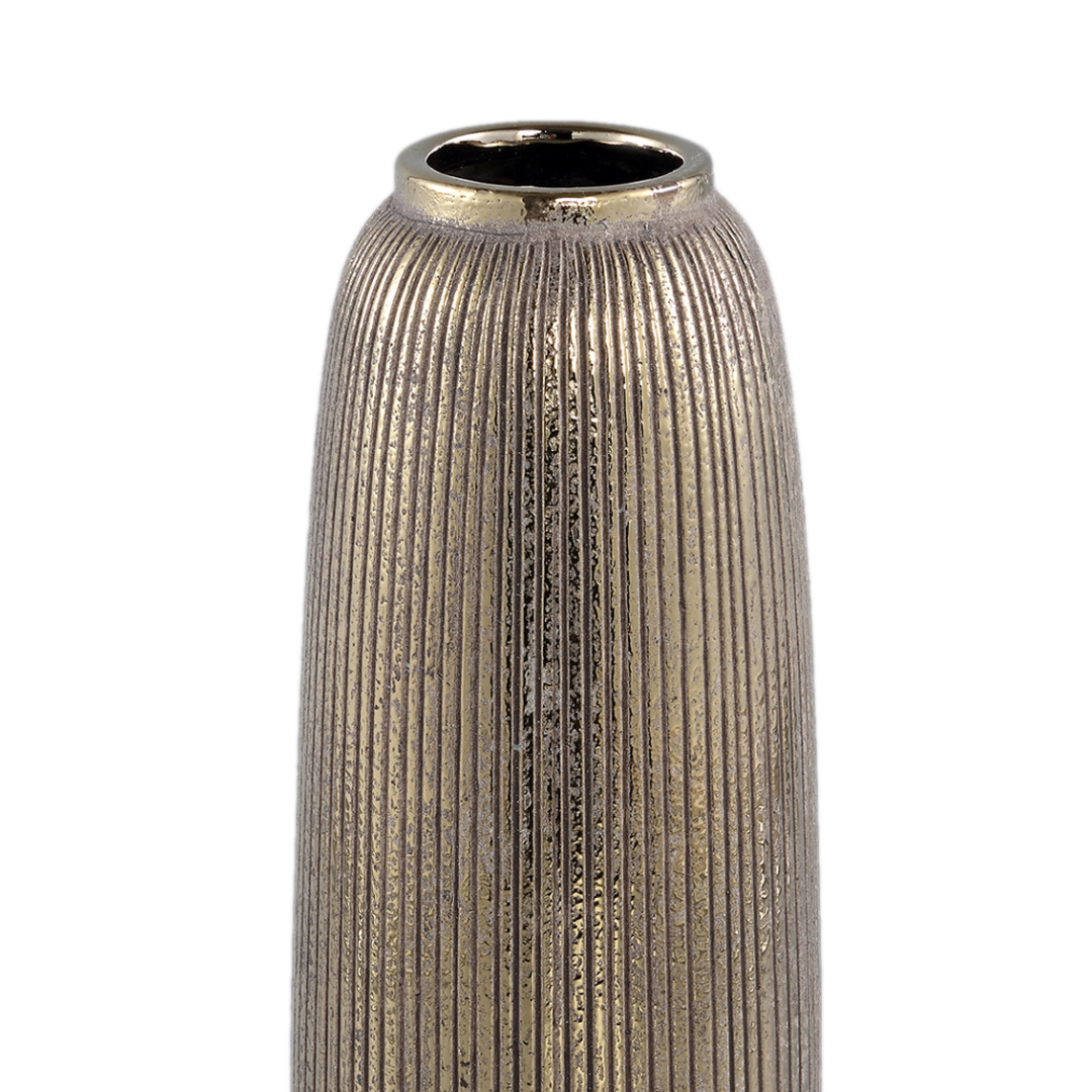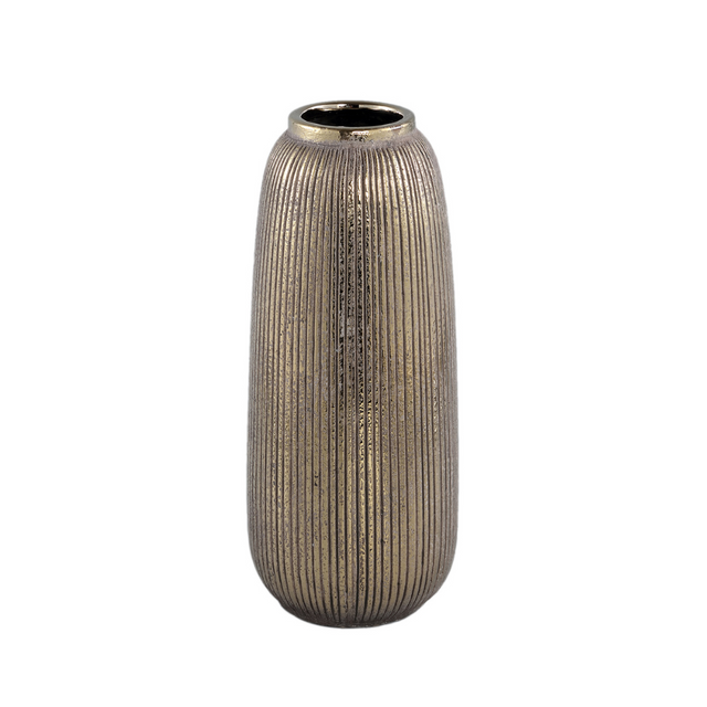 A kül-, és beltéri használatra is alkalmas Avay virágtartó egy vintage hangulatot idéző dekoráció, mely antikolt arany színével, függőleges bordázatával, és elegáns kialakításával stílusos megjelenést kölcsönöz. Ø13.5x32 cm-es mérete miatt könnyedén elhelyezhető bármilyen környezetben.