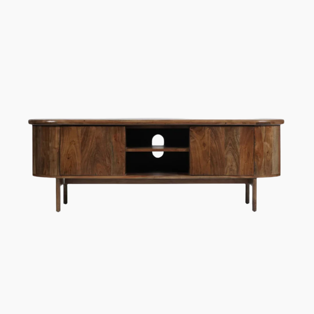 A Bia TV szekrény egyesíti a fa gazdagságát és a finom sziluettet. Ez a modell stílusos és masszív felépítést kínál. Ajtó mögé rejtett, és nyitott polcokkal is rendelkezik, így elegendő helyet biztosít a média felszerelések számára. Akácfából készült, dió színű bevonattal.