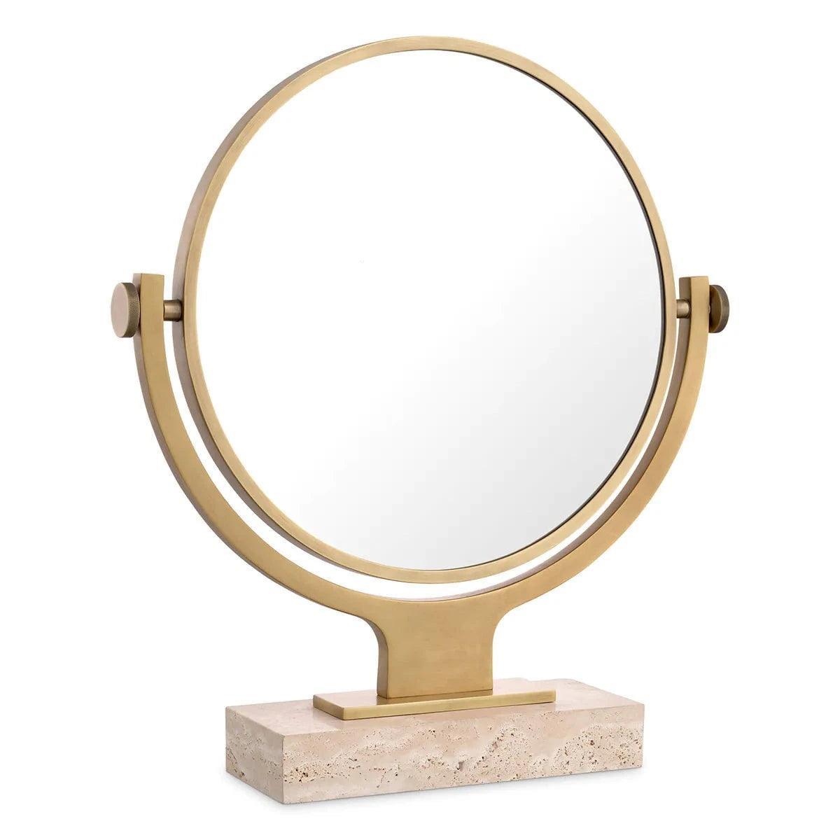 A Briançon fém asztali tükör tökéletes borotválkozáshoz vagy sminkeléshez. Az elegáns design bármely fürdőszobában vagy hálószobában stílusos kiegészítőként szolgál. Ez a kifinomult, forgatható asztali tükör antik sárgaréz bevonattal masszív mészkő alapra van felszerelve. A stabil alap biztosítja, hogy a tükör használat közben mindig biztonságosan a helyén maradjon. A tükör átmérője 40 cm.