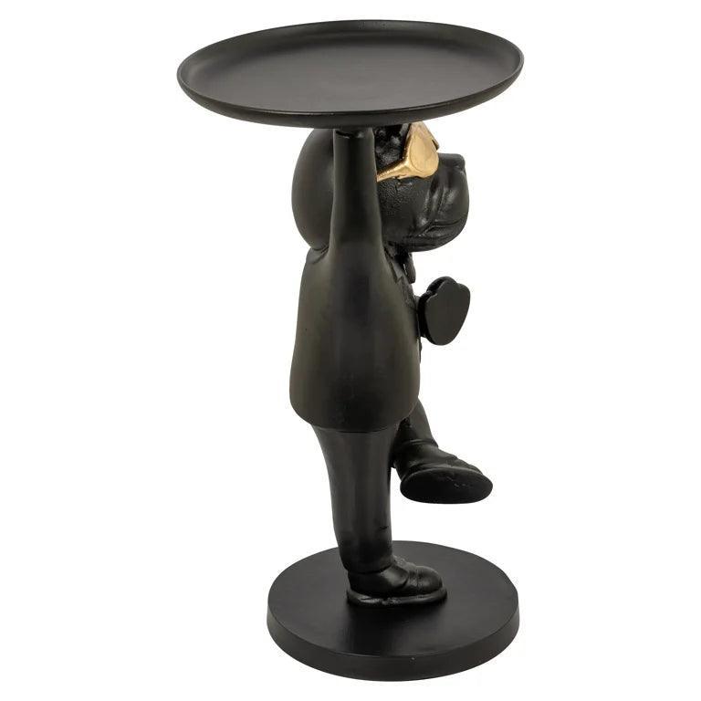 A Bullie lerakóasztal egy különleges és figyelemfelkeltő bútordarab, amely stílusával és egyediségével feldobja a teret. Az asztal alapját egy elegáns ruhába öltözött bulldog figura alkotja, amely játékosságot és eleganciát sugall. A kutya kezében tart egy tálcát, amely az asztallap szerepét tölti be. Ez a kreatív megoldás nemcsak látványos, hanem praktikus is, hiszen a tálca kényelmes felületet biztosít apróbb tárgyak elhelyezésére.