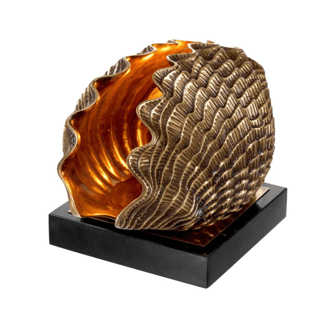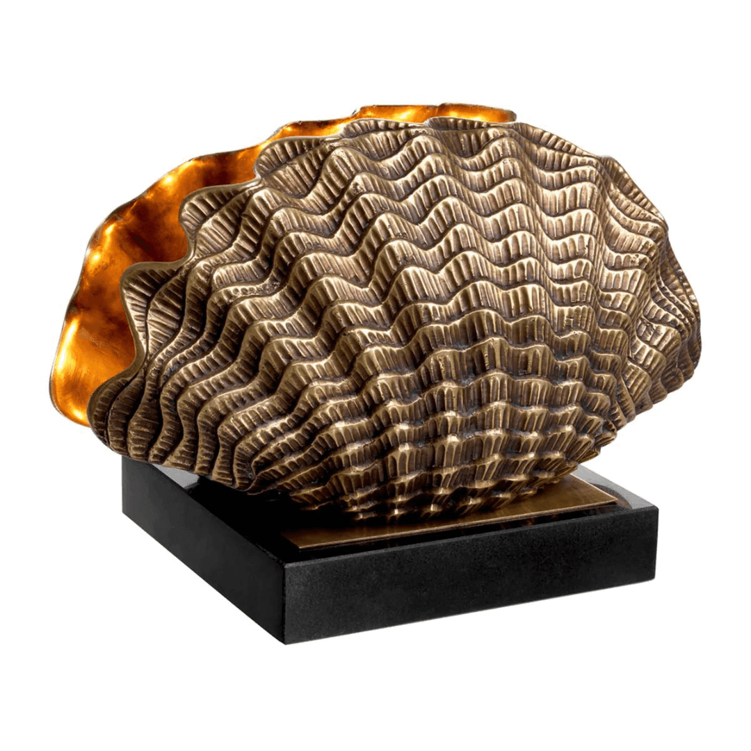 A Burbank asztali lámpa elegáns és modern dizájnt képvisel, amely tökéletes kiegészítője lehet bármely íróasztalnak vagy éjjeliszekrénynek. A lámpa sárgaréz anyagából készült, amely nemcsak időtálló, hanem meleg fényével kellemes atmoszférát teremt a térben. Formai megjelenése egy enyhén kinyílt kagylót ábrázol, amely finom vonalak és részletgazdag kidolgozás révén a természet szépségét idézi meg. A Burbank lámpa alapja egy fekete gránit tömb, amely stabilitást és szilárdságot biztosít a lámpának.
