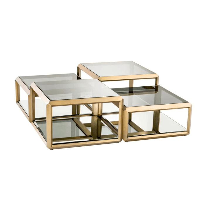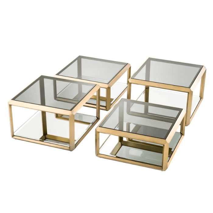 Hozd el a hetvenes évek csábító stílusát a Callum füstüveg dohányzóasztal szettel, mely négy darabból áll. A váz csiszolt sárgaréz bevonattal rendelkezik, melyre asztallapként füstüveg került, az alsó pakolós polcokra pedig tükörüveg lapok. Legyen szó retro vagy kortárs megjelenésről, ez a stílusos dohányzóasztal tökéletes választás lesz. Az alsó polc tükörfelülete tökéletes helyet biztosít dekorációs és használati tárgyaid elhelyezésére. A szett tagjai külön-külön vagy együtt is használhatók, így mindig változatos megjelenést biztosítanak.