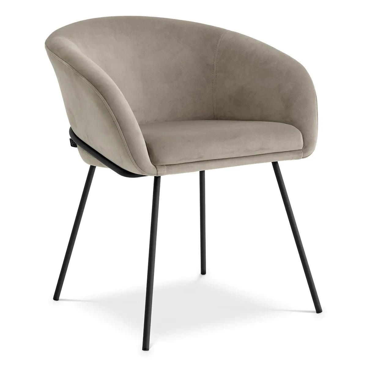 Az étkezőhelyiségekhez tervezett Campus kiváló kiemelő székként vagy sminkszékként is szolgál a hálószobájában, vagy asztali székként otthoni irodájába. A jól párnázott ülés és a ferde karfákba ívelt háttámla ergonomikus kialakítású, és Savona greige bársony kárpitozás díszíti.