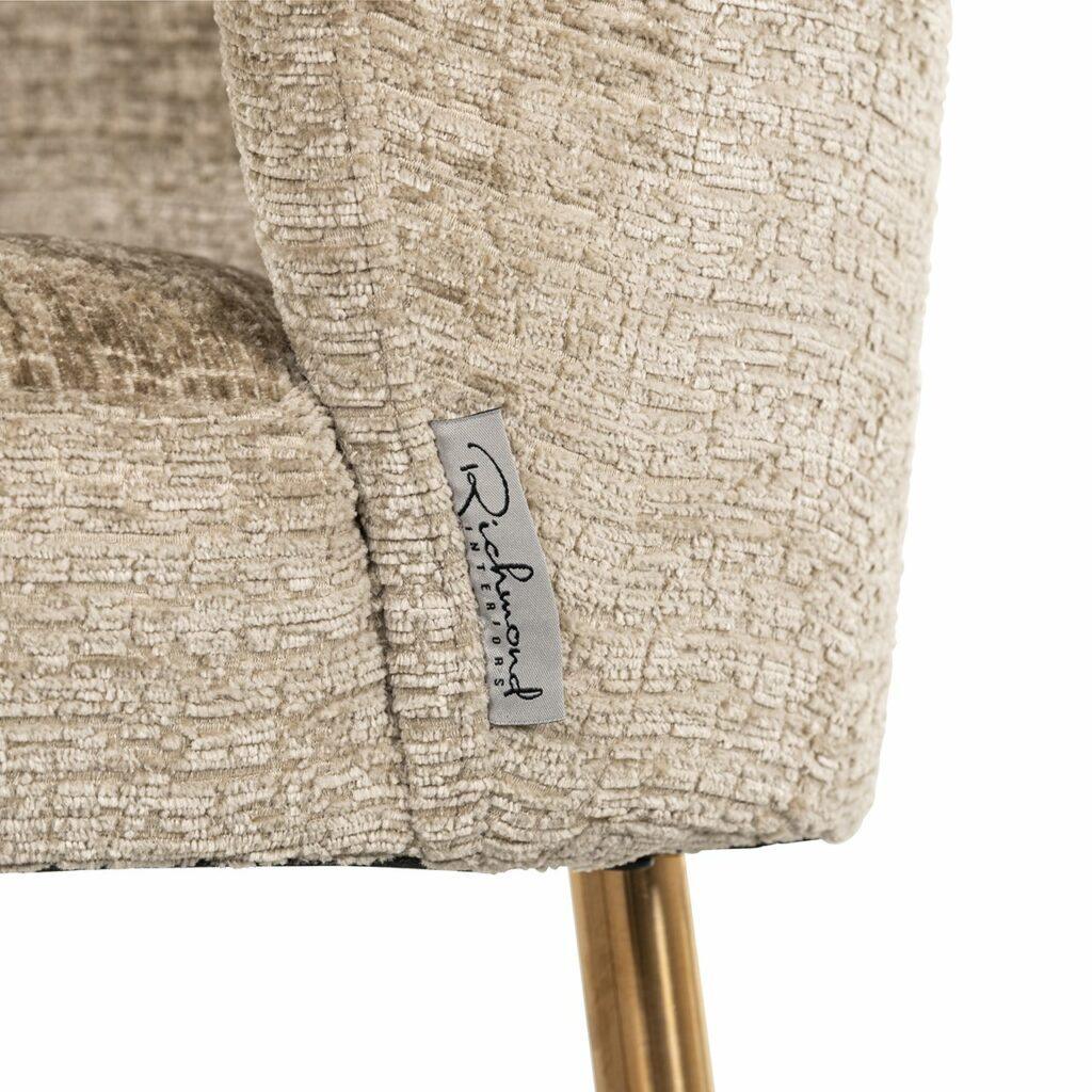 Ez a luxus étkezőszék a kényelem és a stílus tökéletes egyensúlyát kínálja. Kárpitja homok színű szövetből készült, mely luxusérzetet kölcsönöz a terméknek. A szálcsiszolt arany színű fém lábak elegáns és modern megjelenést biztosítanak. Ideális választás étkezőkhöz vagy konyhákhoz, hogy egyedivé tegye az otthoni enteriőrt.
