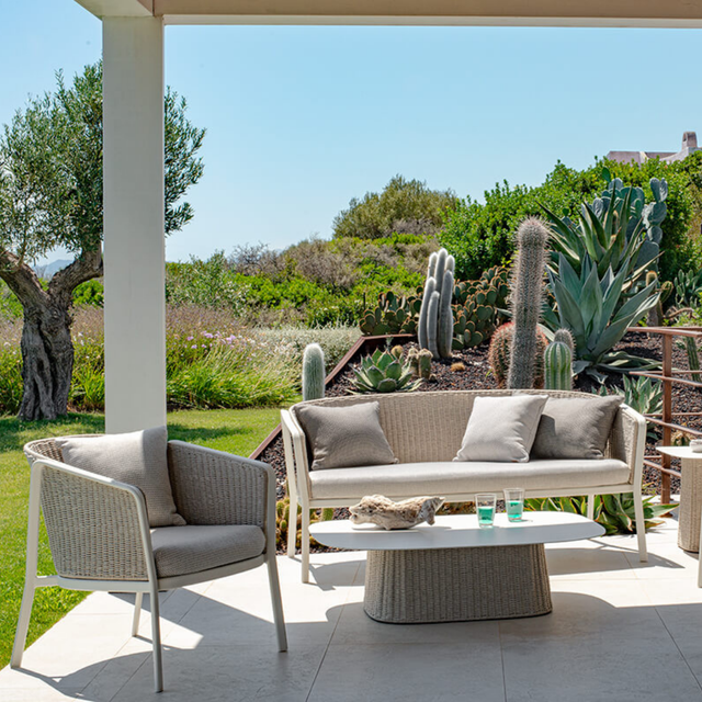 A Carousel kollekció kerti kanapéja modern megjelenéssel rendelkezik, és kényelmes használatot nyújt. A kerete alumínium csőből készült, amelyen kötélszövéses polipropilén fut körbe. Minden kiválasztott anyag garantálja a tartós ellenállást és a színstabilitást. A párnák, a karfák, és a széles ülés pedig hosszantartó, komfortos használatot biztosít.