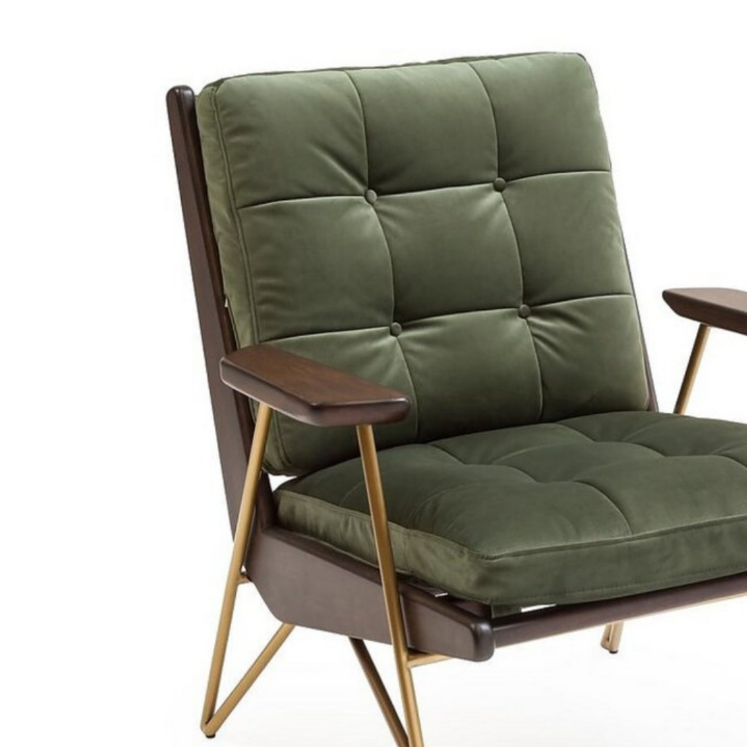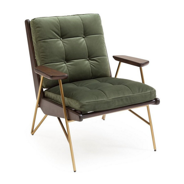 A Como fotel időtlen dizájnja a század közepi koncepciót alkalmazza, és kortárs eleganciával finomítja. A sötét, meleg árnyalatú, tömör fa váz a pihenés és a tartás érdekében döntött, amely a szál csiszolt arany fém szerkezettel kombinálva elegáns és tartós megjelenést kölcsönöz. A sötétzöld bársony kárpitozású, gombos, tűzött párnák mindig hívogató élményt nyújtanak, a gondosan bordázott támasz és a puha kárpit közötti kontraszt pedig visszafogott, kifinomult hangulatot teremt.