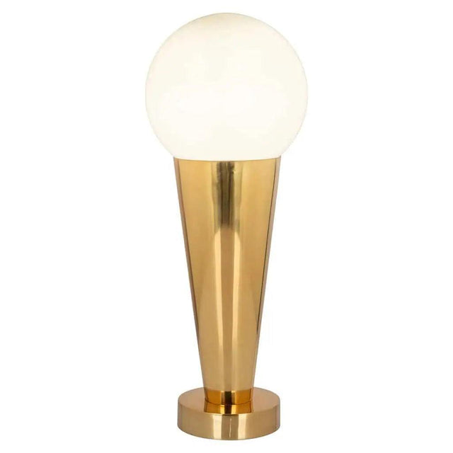 A Cone asztali lámpa egy lenyűgöző modern világítótest, amely a stílus és a funkcionalitás tökéletes kombinációját kínálja. A lámpa fényes arany színű, fáklya szerű váza eleganciát és luxust sugároz, míg a gyönyörű matt üveggömb búra meleg, diffúz fényt biztosít, ideális hangulatot teremtve bármely térben. A Cone asztali lámpa tökéletes hangulatfényt ad a nappali, hálószoba vagy iroda harmonikus berendezésébe.