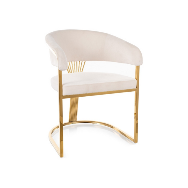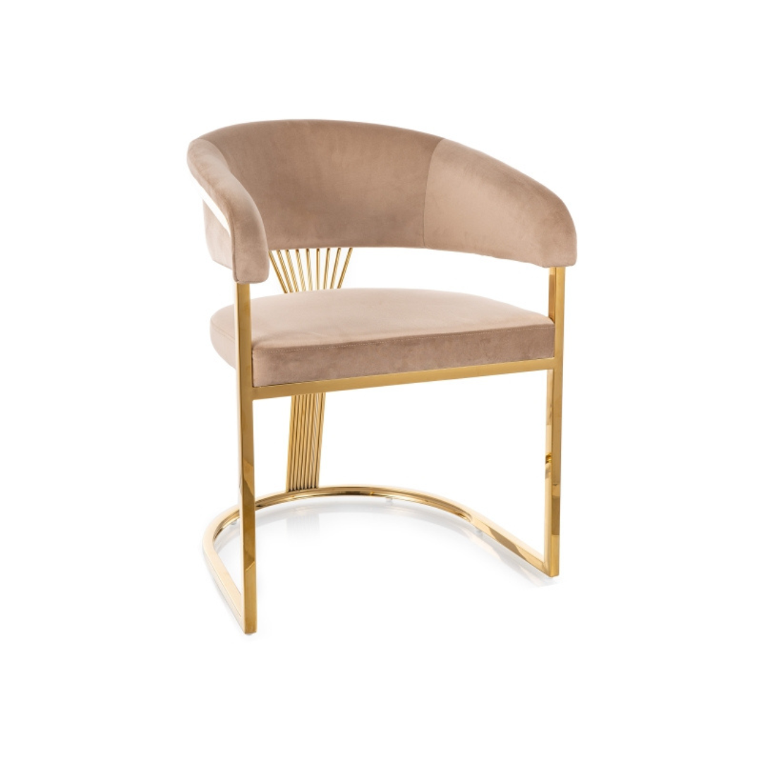A luxus megjelenésű Crown szék garantáltan feldobja otthonod hangulatát. Az arasz színű, különleges formájú láb tökéletes összhangot alkot a bársony kárpitozással, mely bézs és világosbarna színekben érhető el. A fényes váz stabil, míg a puha tapintású borítás, és a félköríves kialakítás kényelmes használatot nyújt.