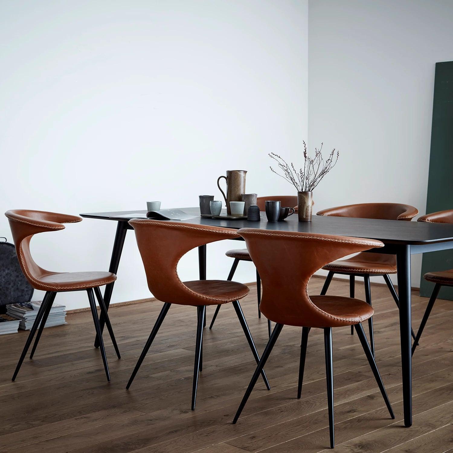 A Flair széket házon belül, a Dan-Form-nál Sanne Protin tervezte. Ez a bútordarab kortárs, különleges és skandináv stílust visz minden otthonba. A kartámaszokká kiterjesztett háttámla igazán kényelmessé varázsolja a széket, és kiváló ülőkomfortot kínál. Ideális választás az étkezőasztal körüli hosszú beszélgetésekhez. A textilbőrből varrott szék világosbarna és fekete színben érhető el, egyenes, kifelé vékonyodó, fekete fém lábakkal.